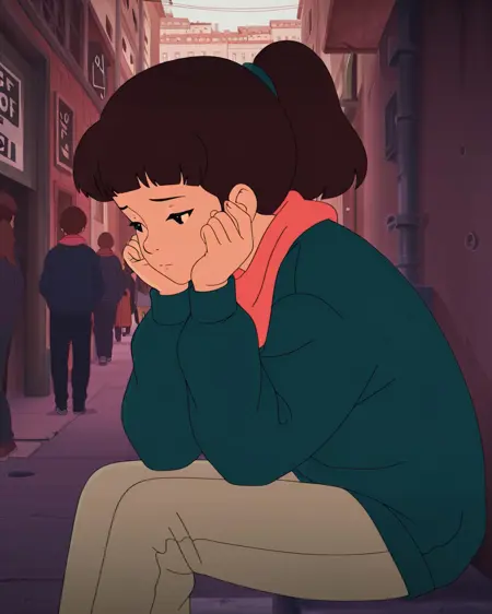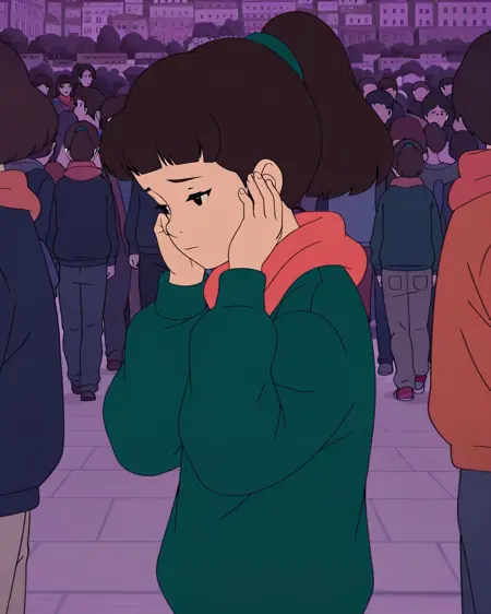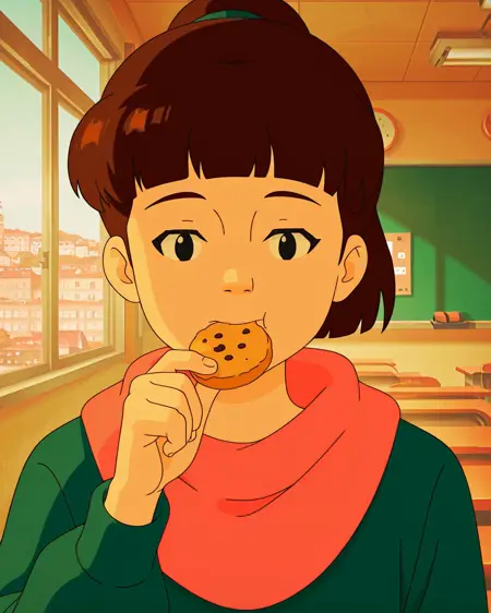 可选提示:平涂色彩、耳机、猫、植物、写作、动漫截图、台灯、窗户、城市