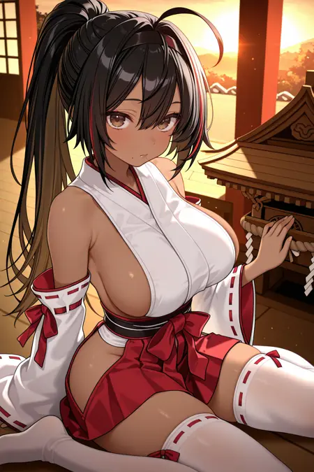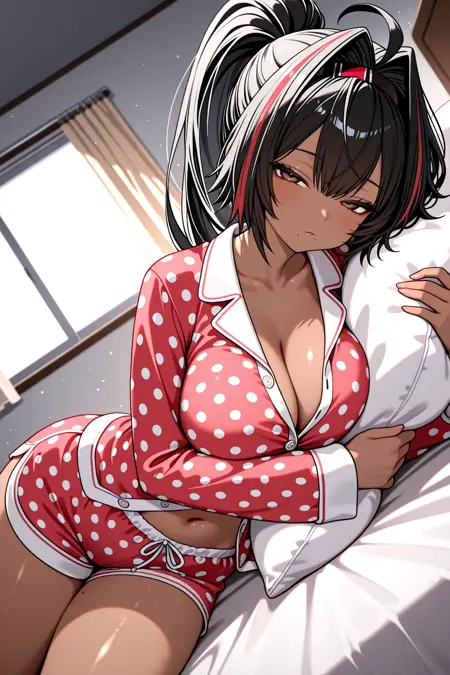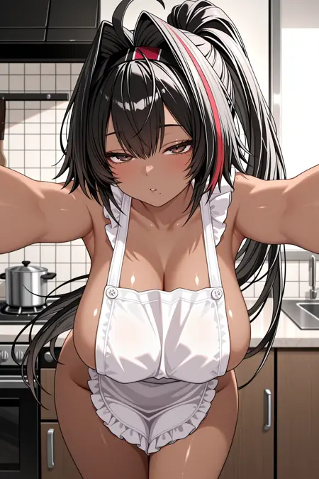 bay (nikke), 검은 피부를 가진 여성, 검은 머리, 긴 머리, 다채로운 머리카락, 줄무늬 머리카락, 빨간 줄무늬, 측면 머리카락, ahoge, 눈 사이의 머리카락, 검은 헤어밴드, 꼬리머리, 높은 꼬리머리, 갈색 눈, 입 밑에 두더지