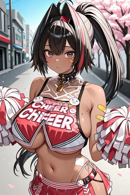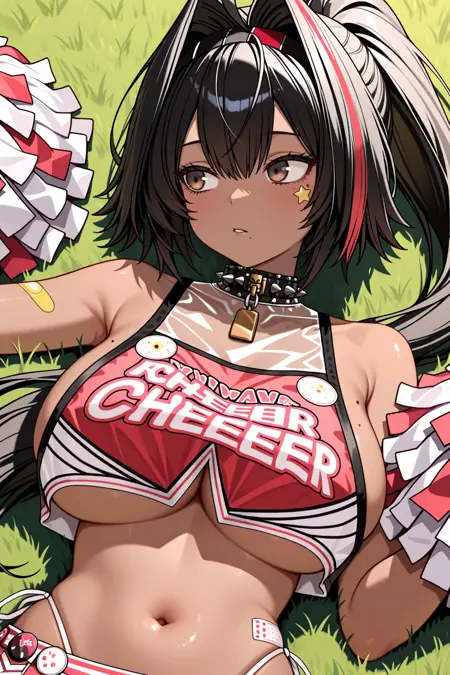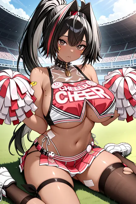 가슴 사이의 틈, 측면 유방, 아래 유방, 배꼽, 복부, 어깨 노출, 관자놀이 뼈, 얼굴에 스티커, 두더지, 가슴에 두더지, 입 밑에 두더지, 짧은 상의, 소매 없는 티셔츠, 이색 티셔츠, 빨간 티셔츠, 속옷, 하이레그 속옷, 속옷, 주름치마, 빨간 치마, 미니스커트, 이색 스커트, 체어리더, 체어리더 펌프, 칼라, 송곳니 칼라, 자물쇠가 걸린 칼라, 별(기호), 별 스티커, 옷에 쓰인 글자, 검은 허벅지 양말, 한쪽 허벅지 양말, 허벅지 스트랩, 흰 운동화, 검은 무릎 양말, 찢어짐