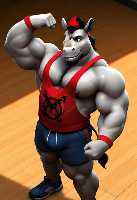 Reinforcement Prompts: "furry, rhino, tail, mohawk, black eyes, muscular, masculine, mature male, bara, large pectorals"