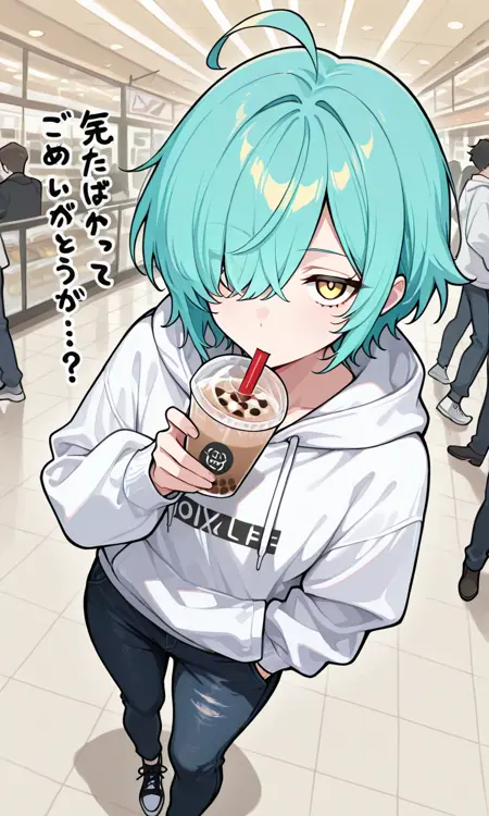 1boy, aqua hair, hair over one eye, ahoge, yellow eyes,