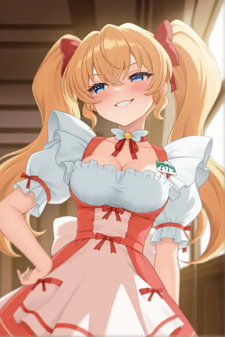 她没有特定的服装,但大多数数据都是基于她的女服务员装扮训练的,因此在尝试生成其他服装时请小心,以免她的女服务员装扮特征混入其中。