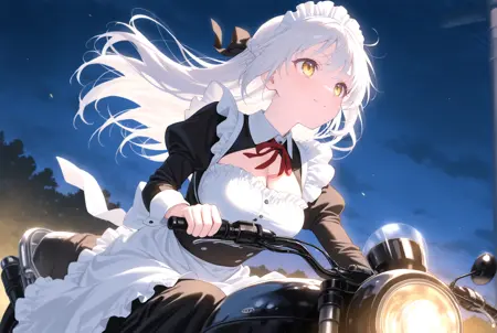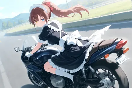 元から学習はされていますが、バイクの造形や姿勢を改善させます。トリガー以外で motor vehicle, motorcycle, outdoors, riding, road, driving, floating hair, wind, headlight 辺りはお好みで。