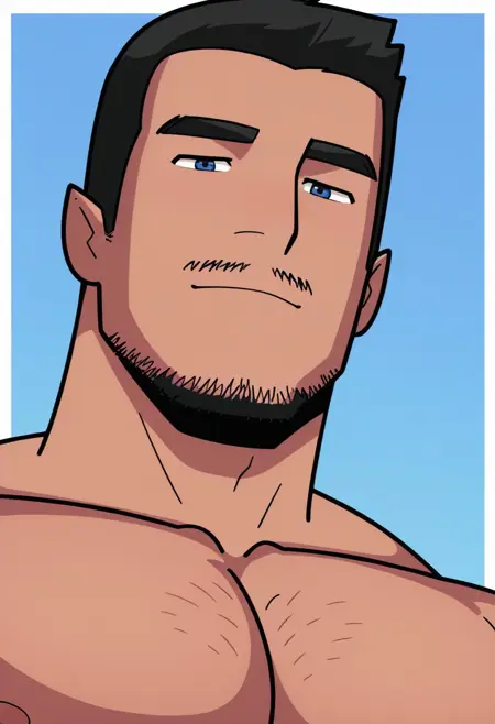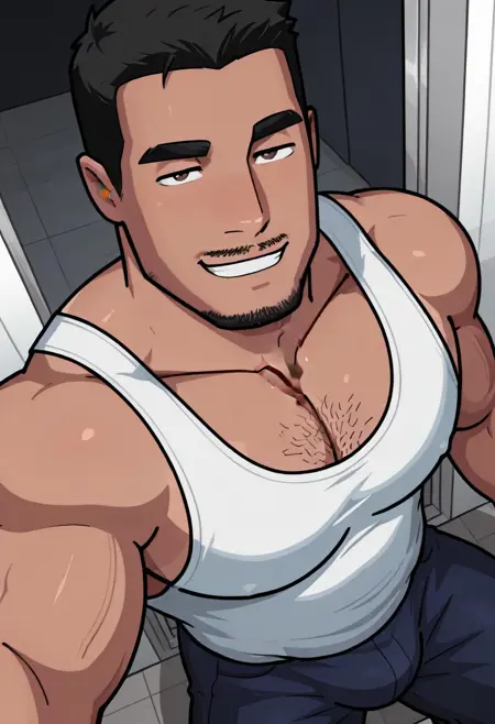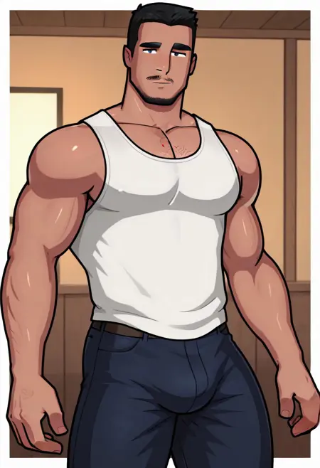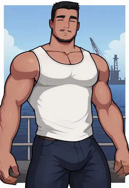Humplex 타루크, 즉 오일 리그 작업자, 단독, 남성 중심, 성숙한 남성, 바라, 근육질, 검은 머리, 단발, 수염, 콧수염, 두꺼운 눈썹, 얼굴 털, 모자, 텅셔츠, 파란색 유니폼 상의, 파란색 바지, 벨트, 노란색 티엉, 잭스트랩