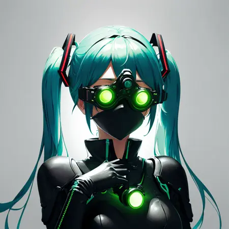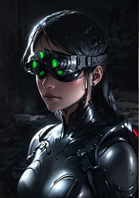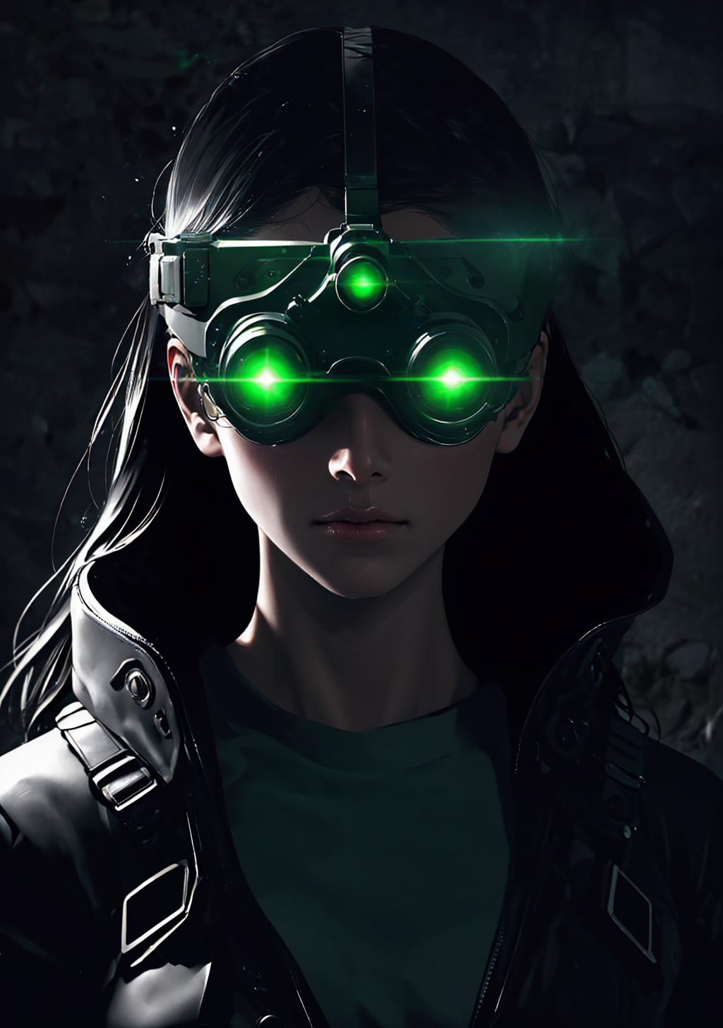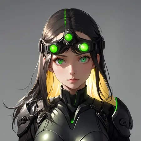 Useful prompt : goggles on head, goggles, green eyes, glowing, glowing eyes