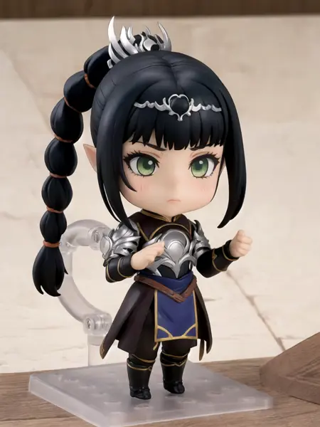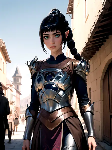dsshadowheart, 검은 머리, 긴 머리, 팔랑머리, 앞머리, 땋은 머리, 머리 장식, 뾰족한 귀, 녹색 눈, 원형 머리장식, 갑옷, 가슴판, 어깨보호대