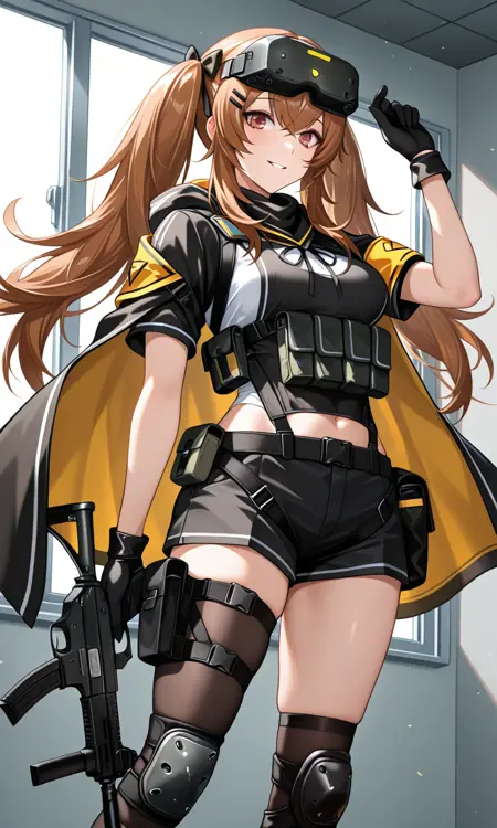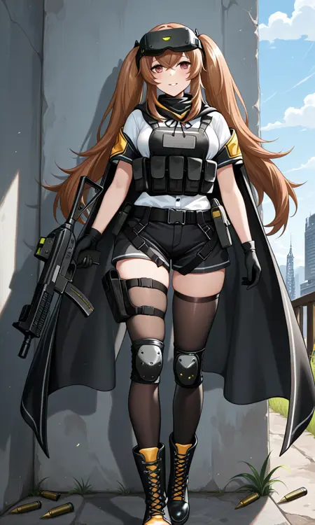 lenna ump9、ツインテール、タイプ2、スソ付き、膝パッド、ショートパンツ、片方の膝パッド、タクティカル服、弾薬ポーチ、ヘッドマウントディスプレイ、黒いショートパンツ、ブーツ、黒い手袋、ポーチ、マガジン\(武器\)、カペ、ショートスリーブ、