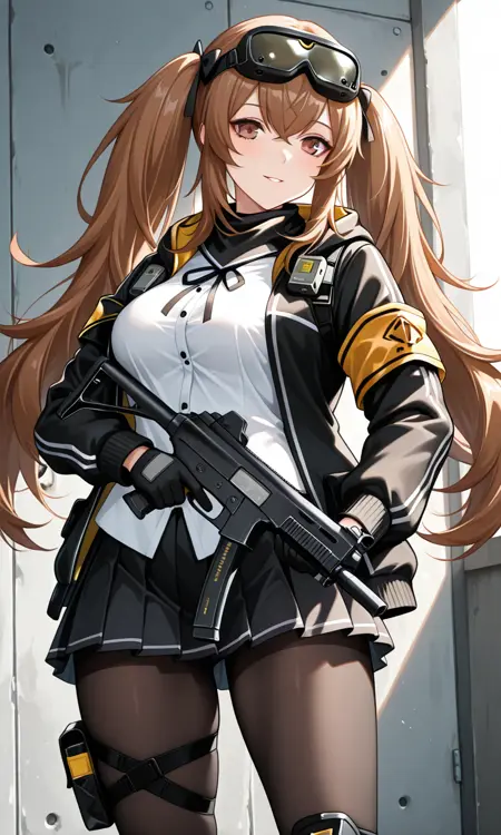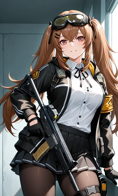 シャツ、スカート、ロングスリーブ、手袋、スソ付き、持ち物、リボン、ジャケット、白いシャツ、武器、パンスト、プリーツスカート、開いた服、黒い手袋、黒いスカート、武器を持っている、開いたジャケット、黒いジャケット、銃、黒いリボン、銃を持っている、ゴーグル、腕章、頭にゴーグル、トリガーディシプリン、サブマシンガン、黄色い腕章、H&K ump、