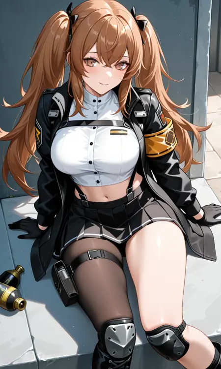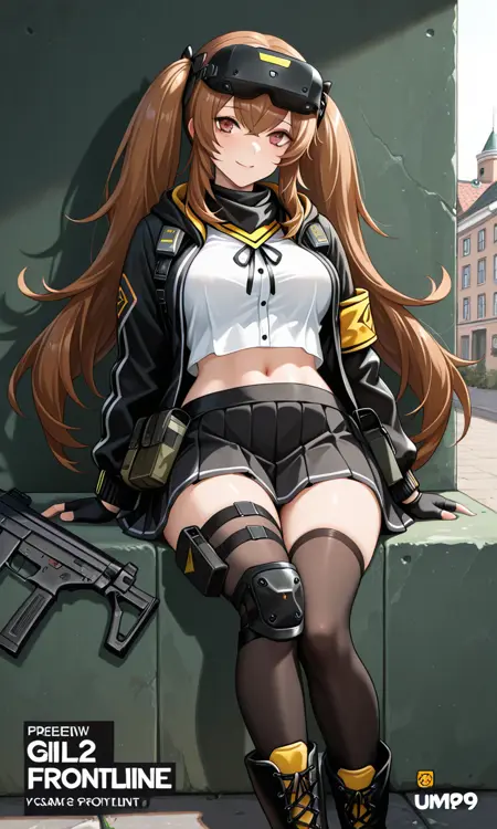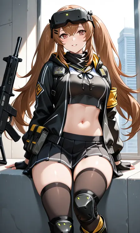 lenna ump9、ツインテール、タイプ1、サブマシンガン、スソ付き、片方の膝パッド、スカート、へそ、ジャケット、黒い手袋、ヘッドマウントディスプレイ、ブーツ、黒いスカート、弾薬ポーチ、腹部、プリーツスカート、