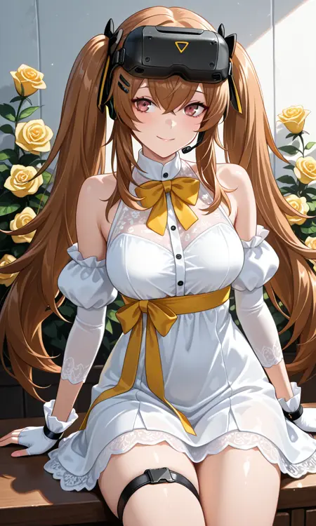 lenna ump9、ツインテール、タイプ3、指なし手袋、白い手袋、ヘッドセット、黄色いリボン、黄色い bow、ヘッドマウントディスプレイ、黄色いバラ、肩を露出、太ももストラップ、ふわふわスリーブ、白いドレス、取り外し可能なスリーブ、