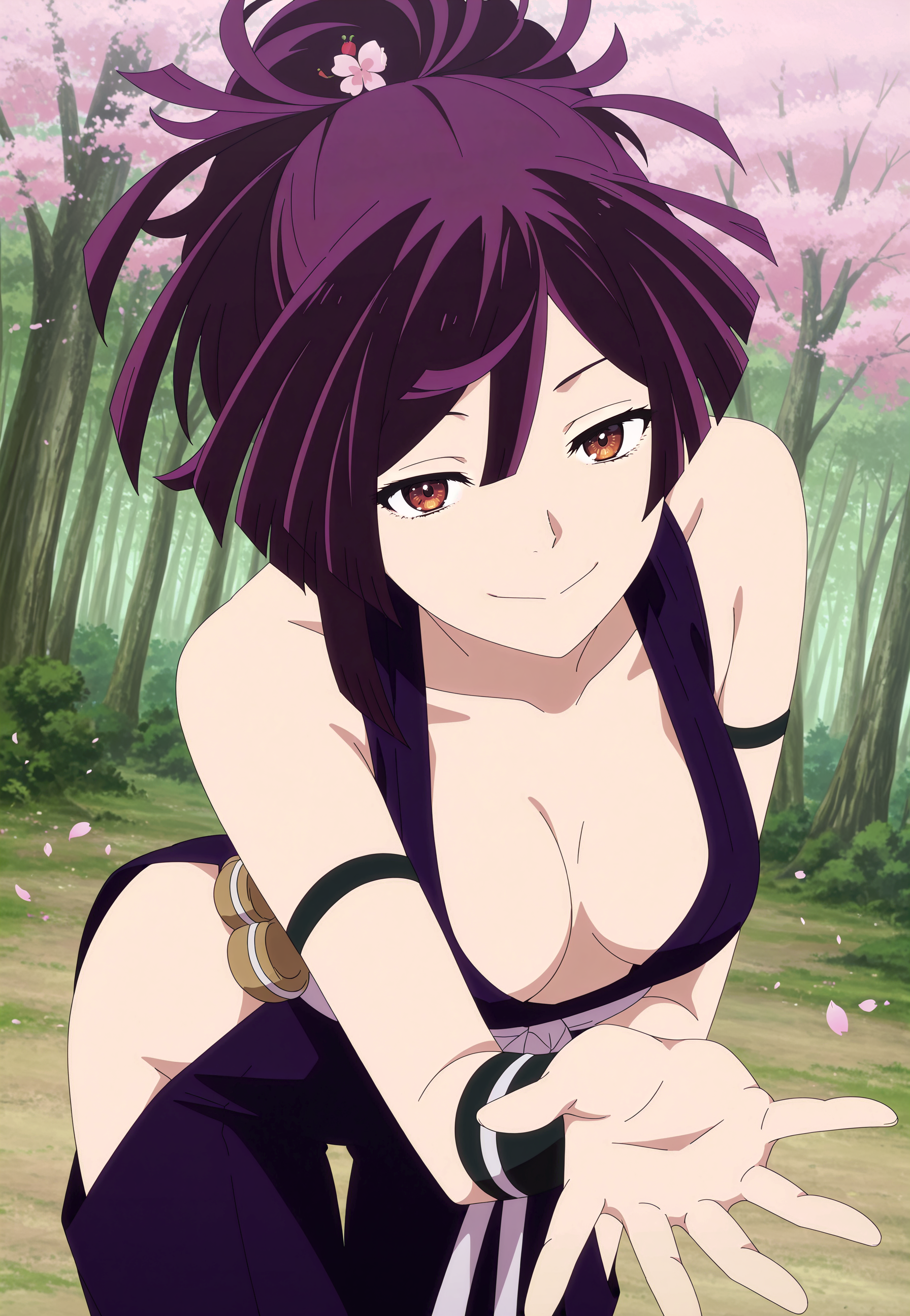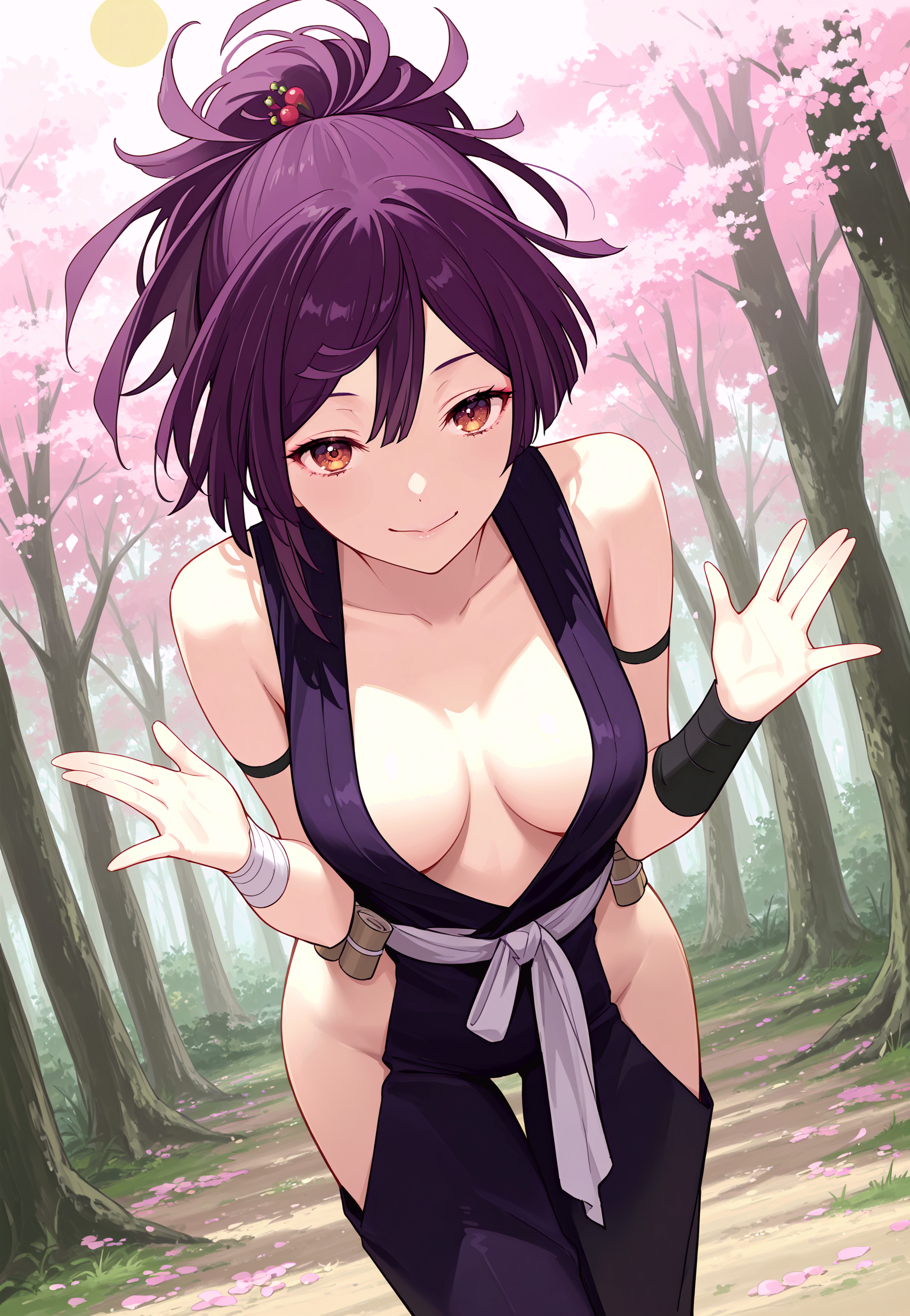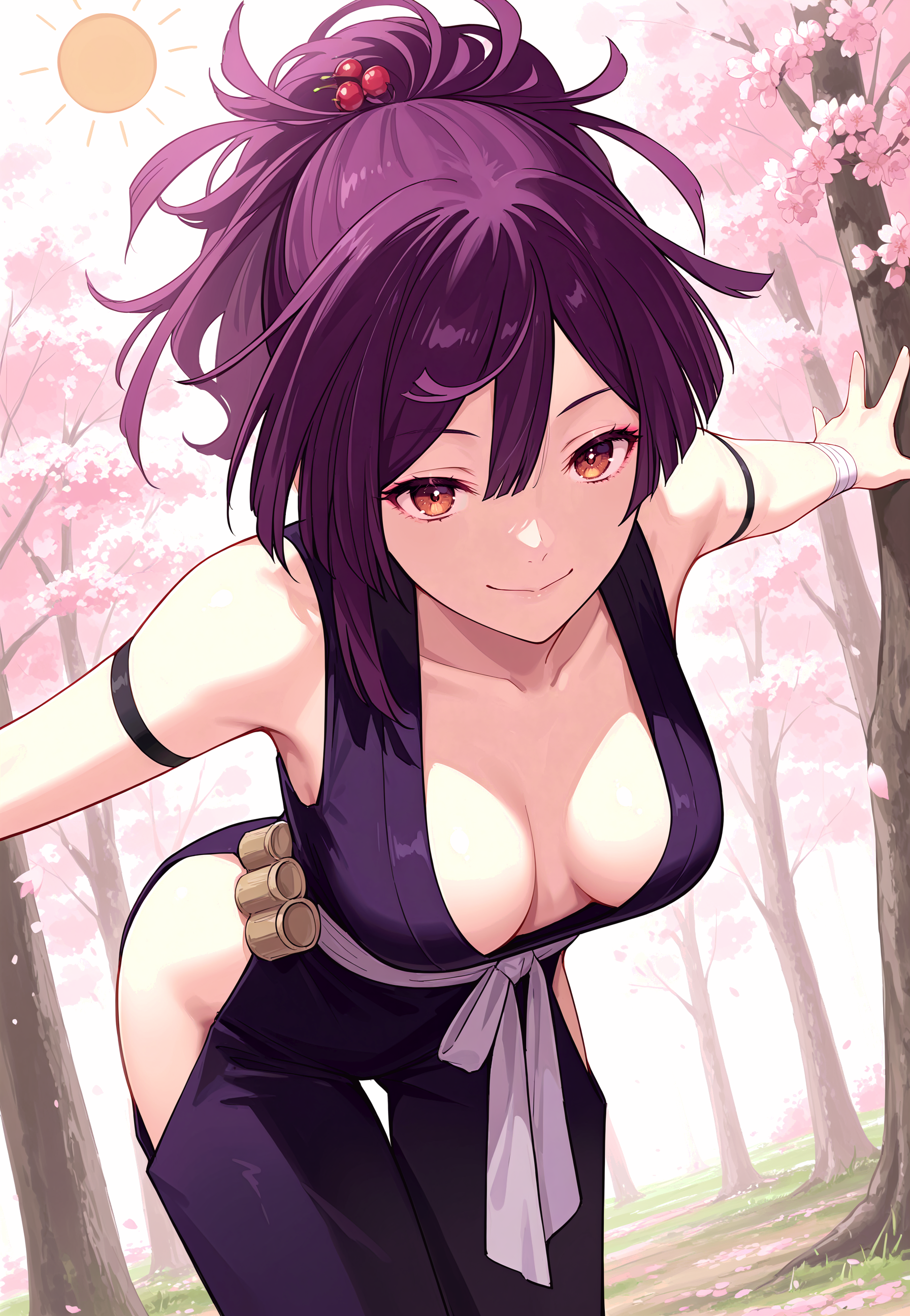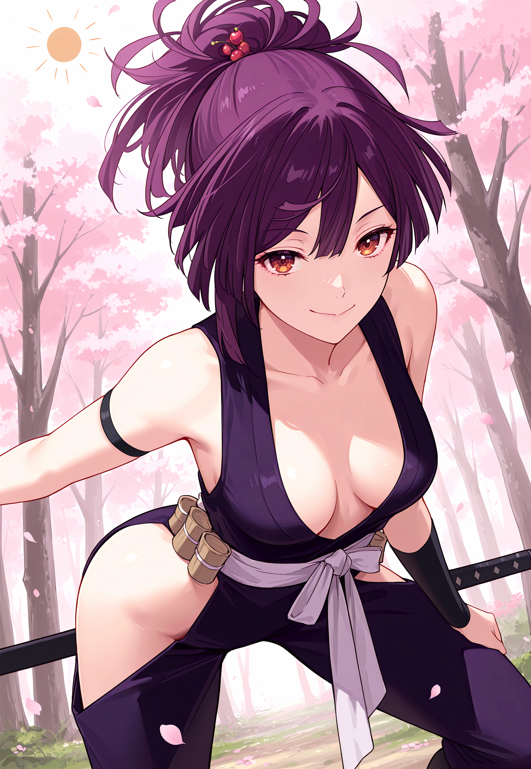 "1girl, yuzuhira, kuinoichi, purple hair, brown eyes, ninja, japanese clothes"