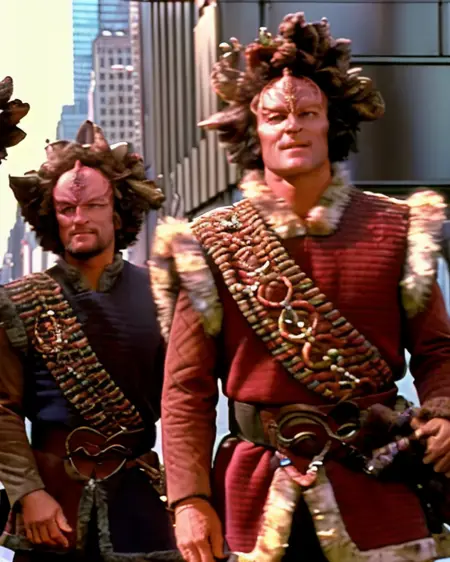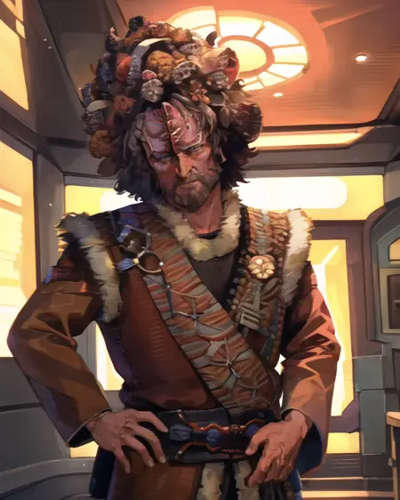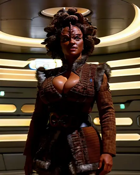 创建卡宗角色。基于《星际迷航:航海家号》中的34张卡宗图像训练。768px,1700步。提示词为 kazon。训练中使用的其他有助于生成的词汇:红棕色赭石色皮肤,粗糙隆起的额头,棕色/绿色/灰色 带叶子的卷发。