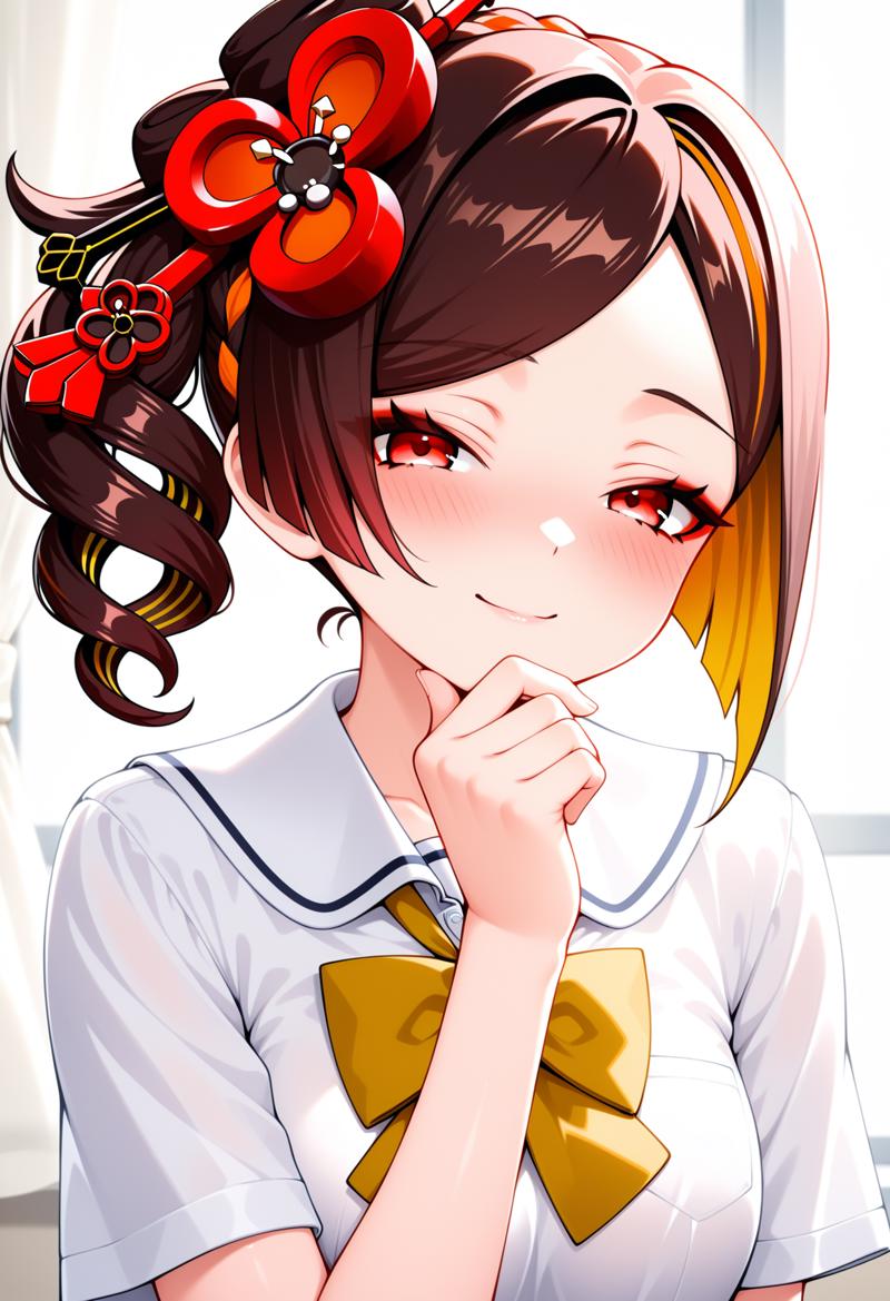 Chiori, 1girl,school uniform,jk,white clothes, solo, smile, hair ornament, looking at viewer, upper body, blush, closed mouth, hand on own chin, blonde hair