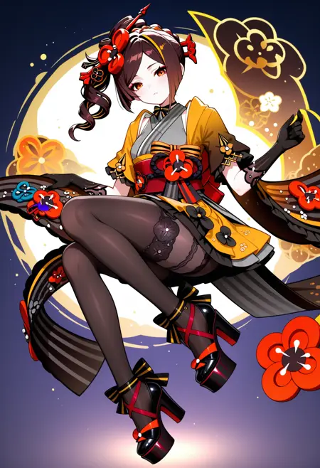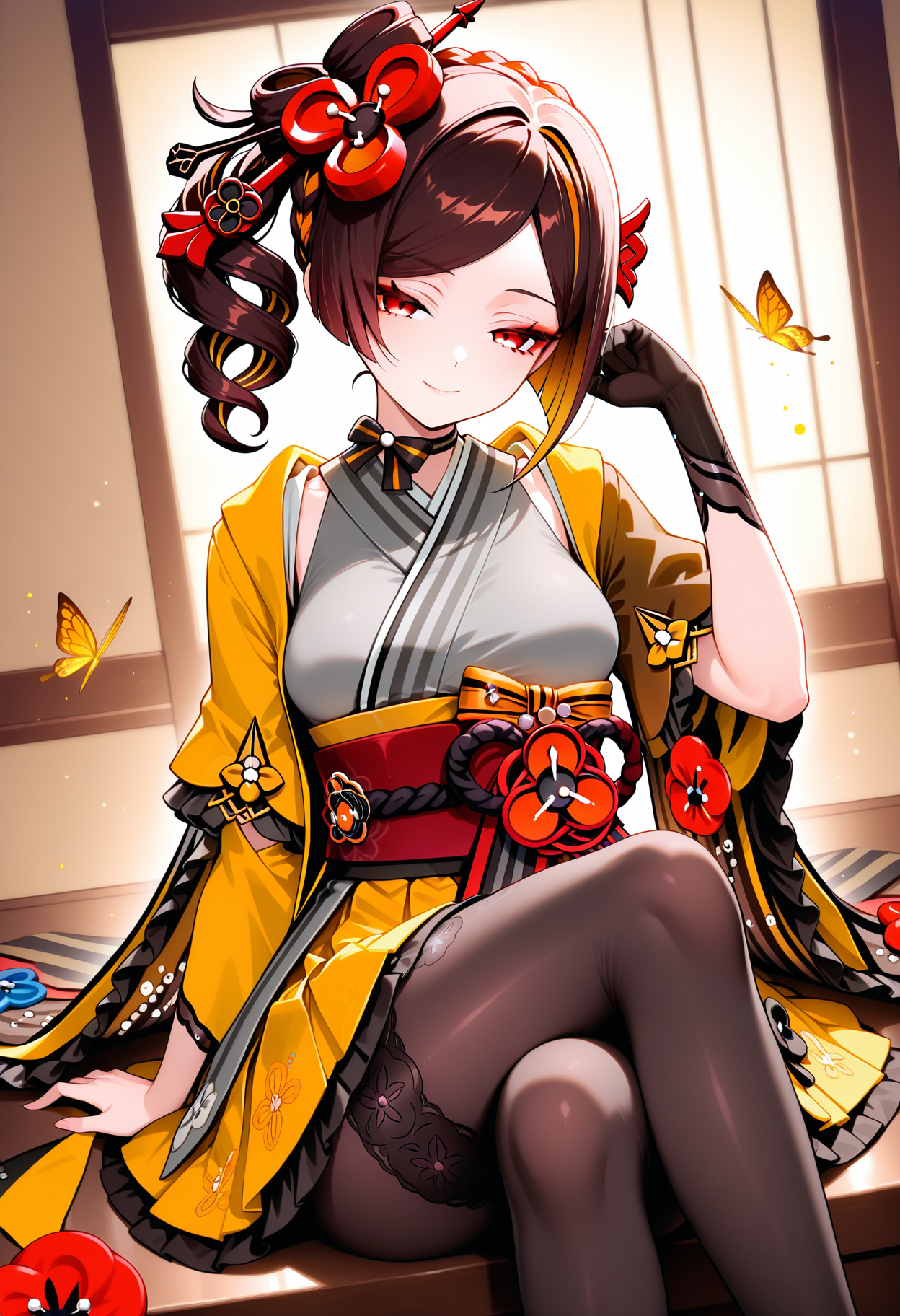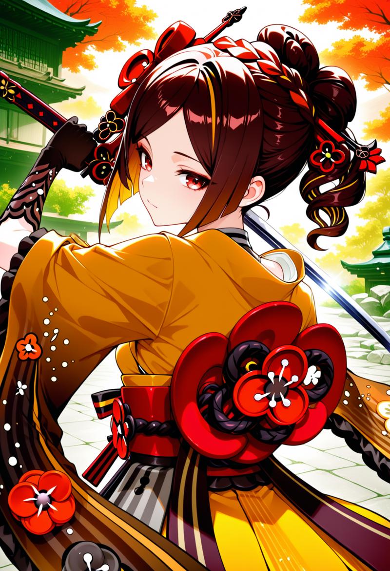 Chiori, 1girl, sword, japanese clothes, kimono, weapon, solo, holding, gloves, sash, holding weapon, holding sword, hair ornament, obi, black gloves, looking at viewer, katana, yellow kimono, hair bun, looking back, upper body, flower, outdoors, wide sleeves, from behind