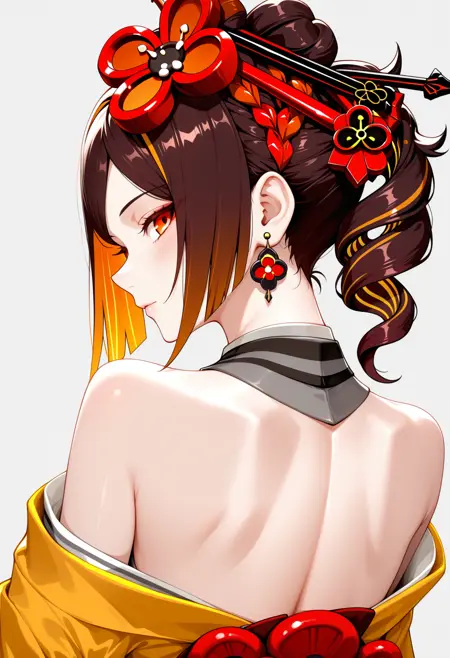 Chiori, 1girl, solo, hair ornament, bare shoulders, earrings, looking back, from behind, jewelry, back, upper body, looking at viewer, kimono, japanese clothes, grey background, back focus, simple background, orange eyes, orange hair