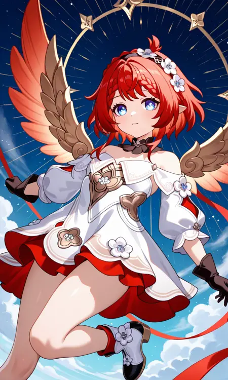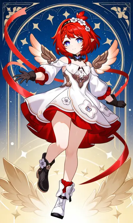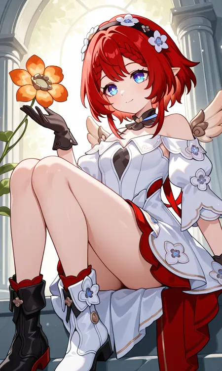 트리비(혼카이: 스타레일), 단발, 파란 눈, 빨간 머리, 뾰족한 귀, 땋은 머리, 꽃, 머리 장식, 헤어밴드, 머리 꽃, 검은 헤어밴드, 리본, 작은 가슴, 허벅지, 장갑, 검은 장갑, 드레스, 흰 드레스, 날개, 꽃, 맞지 않는 신발, 부츠, 흰 신발, 검은 신발, 어깨 노출, 풍선 소매, 분리된 칼라, 비대칭 신발, 어깨 드레스