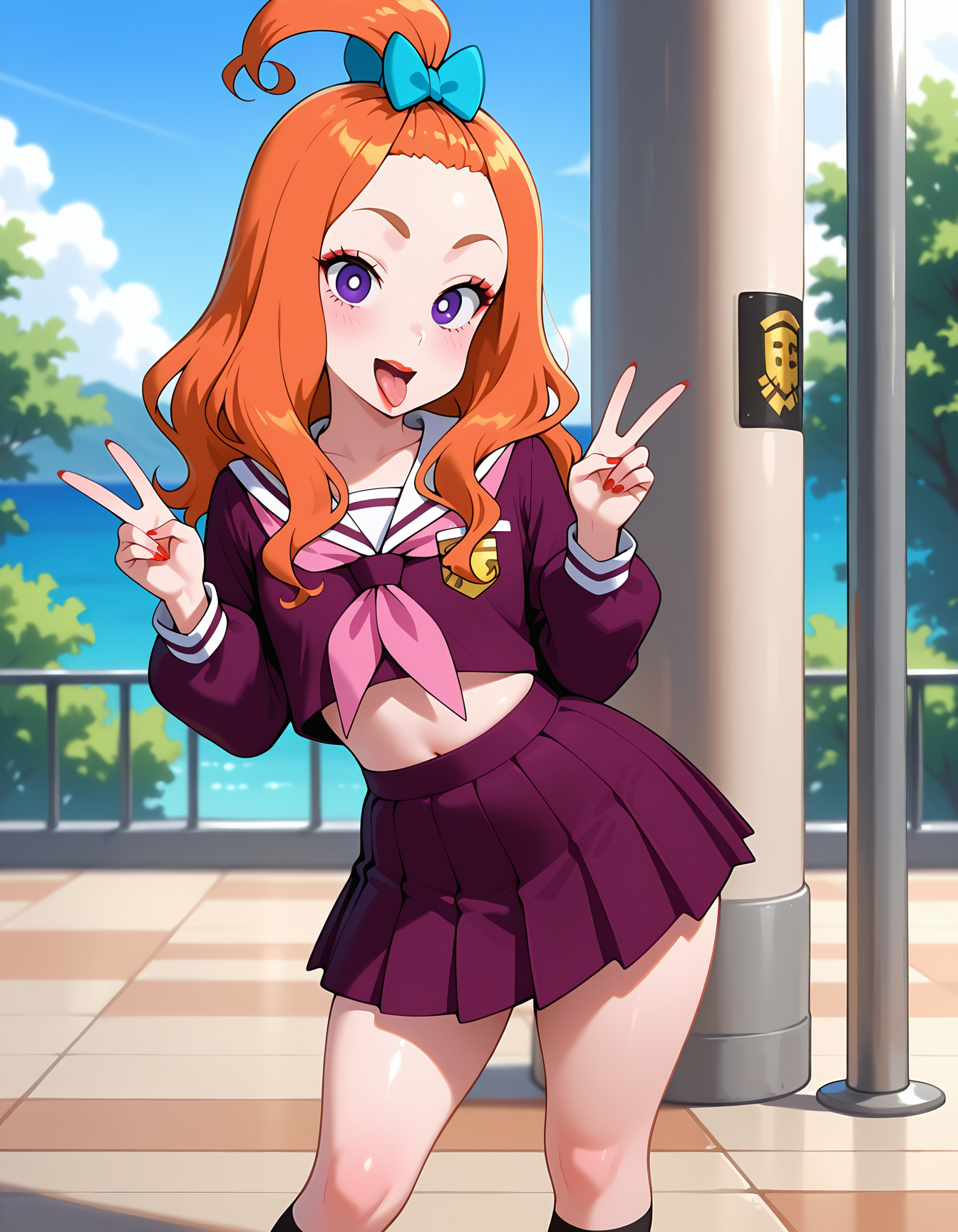 serafuku, midriff, black socks, brow shoes, bow, purple shirt, purple skirt