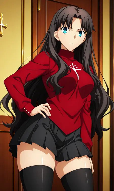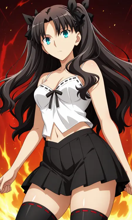 도사카 린, 검은 머리, 다른 헤어스타일 긴 머리, 매우 긴 머리, 풀어둔 머리, 중간으로 갈라진 앞머리, 푸른 눈, 시청자 바라보기, 애니메이션 컬러링, 중간 크기 가슴, 허벅지, 두꺼운 허벅지, 측면 머리카락,