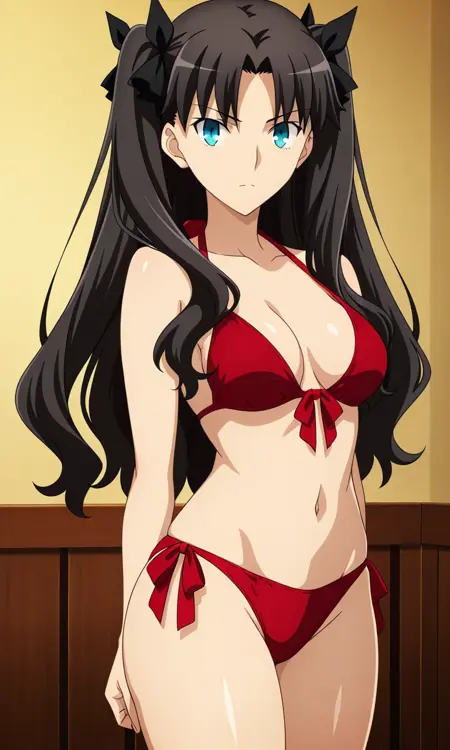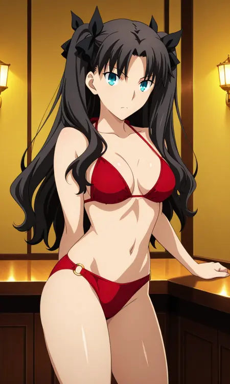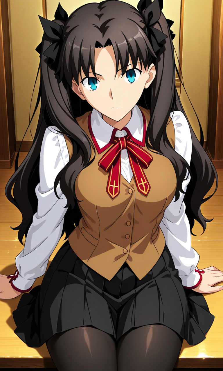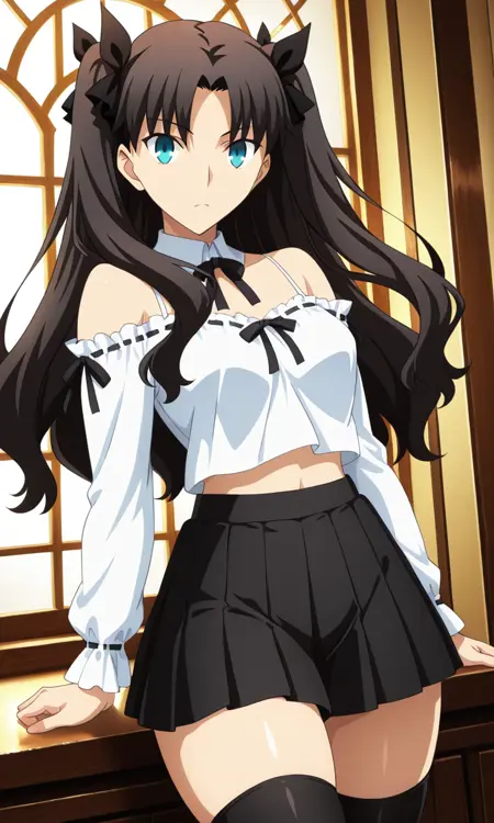 도사카 린, 검은 머리, 긴 머리, 양쪽 위로 올린 머리, 중간으로 갈라진 앞머리, 머리 리본, 푸른 눈, 시청자 바라보기, 애니메이션 컬러링, 중간 크기 가슴, 허벅지, 두꺼운 허벅지, 측면 머리카락,