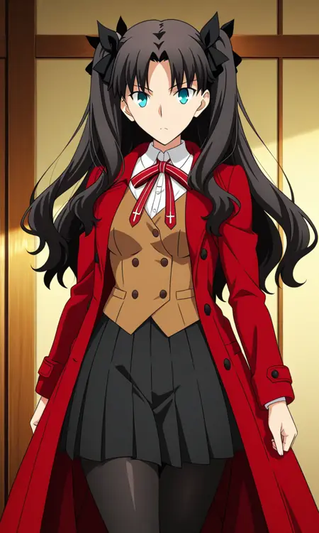 도사카 린(성숙한), 긴 머리, 매우 긴 머리, 풀어둔 머리, 머리 아래로 흐르는, 측면 페어리테일이 머리에 녹아듦, 검은 머리, 푸른 눈, 성숙한 여성, 가슴, 중간 크기 가슴, 허벅지, 측면 머리카락, 애니메이션 컬러링,
