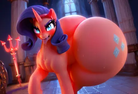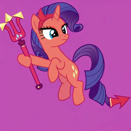 lora:DevilRarityPony:1, Devil Rarity, imp rarity, demon rarity, red body, purple mane and tail, curled mane, trident, devil horns, spade tail, cutie mark yellow diamonds