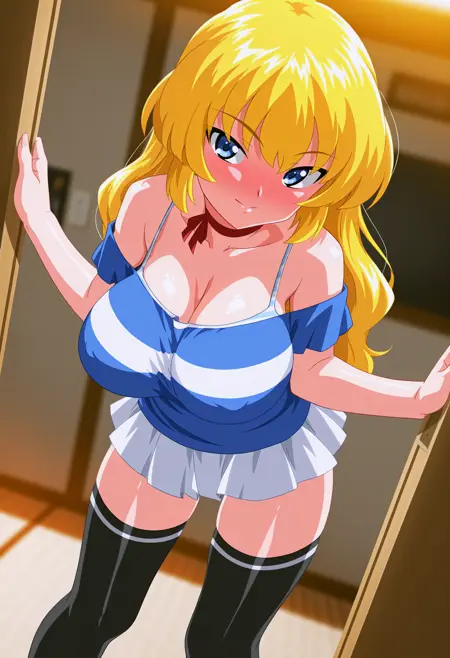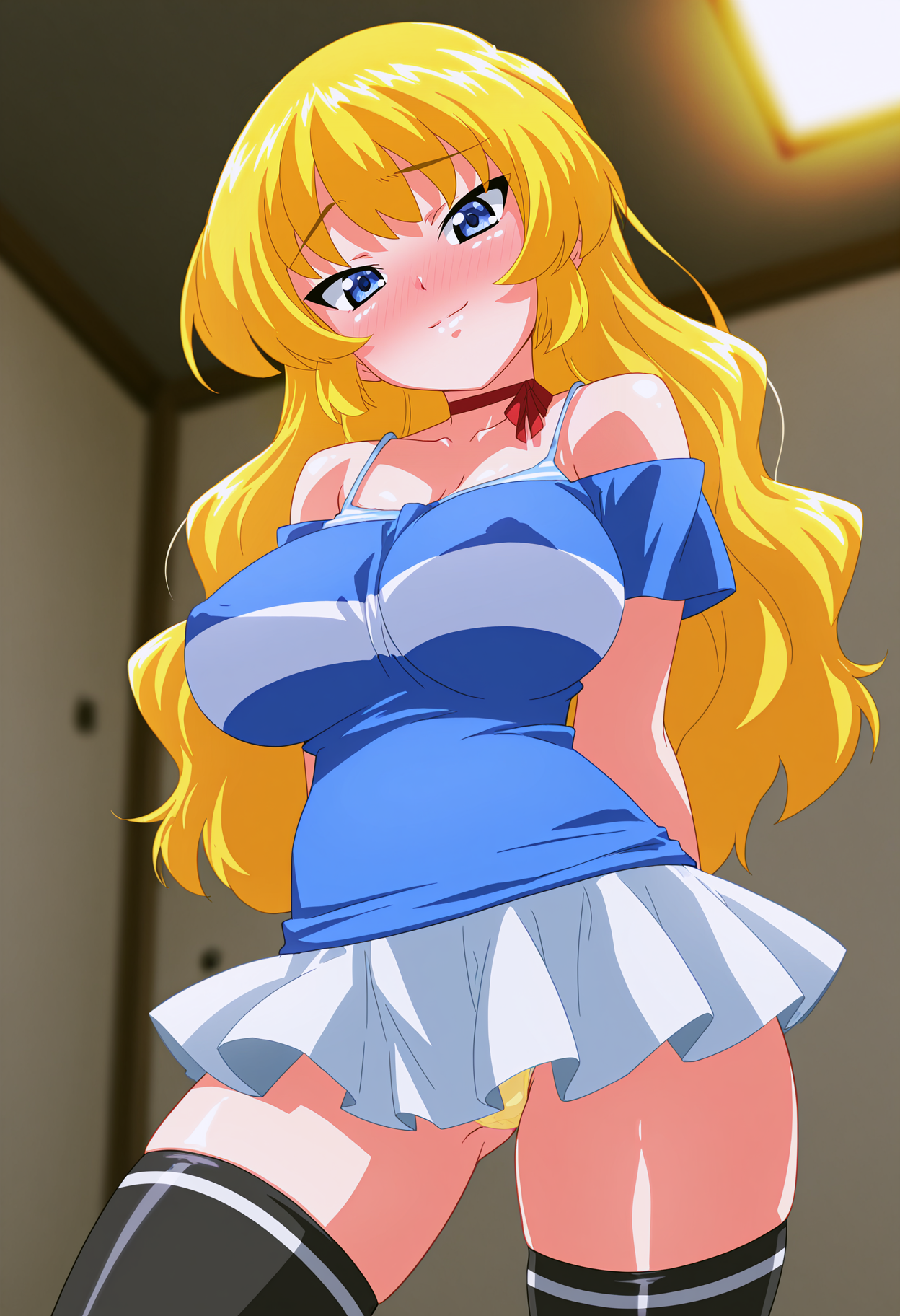 カジュアルスタイル、片肩出しシャツ、ツートーンシャツ、青シャツ、白シャツ、シャツの下にスパゲッティストラップ付き黄色のタンクトップ、白ミニスカート、黒タイツ、