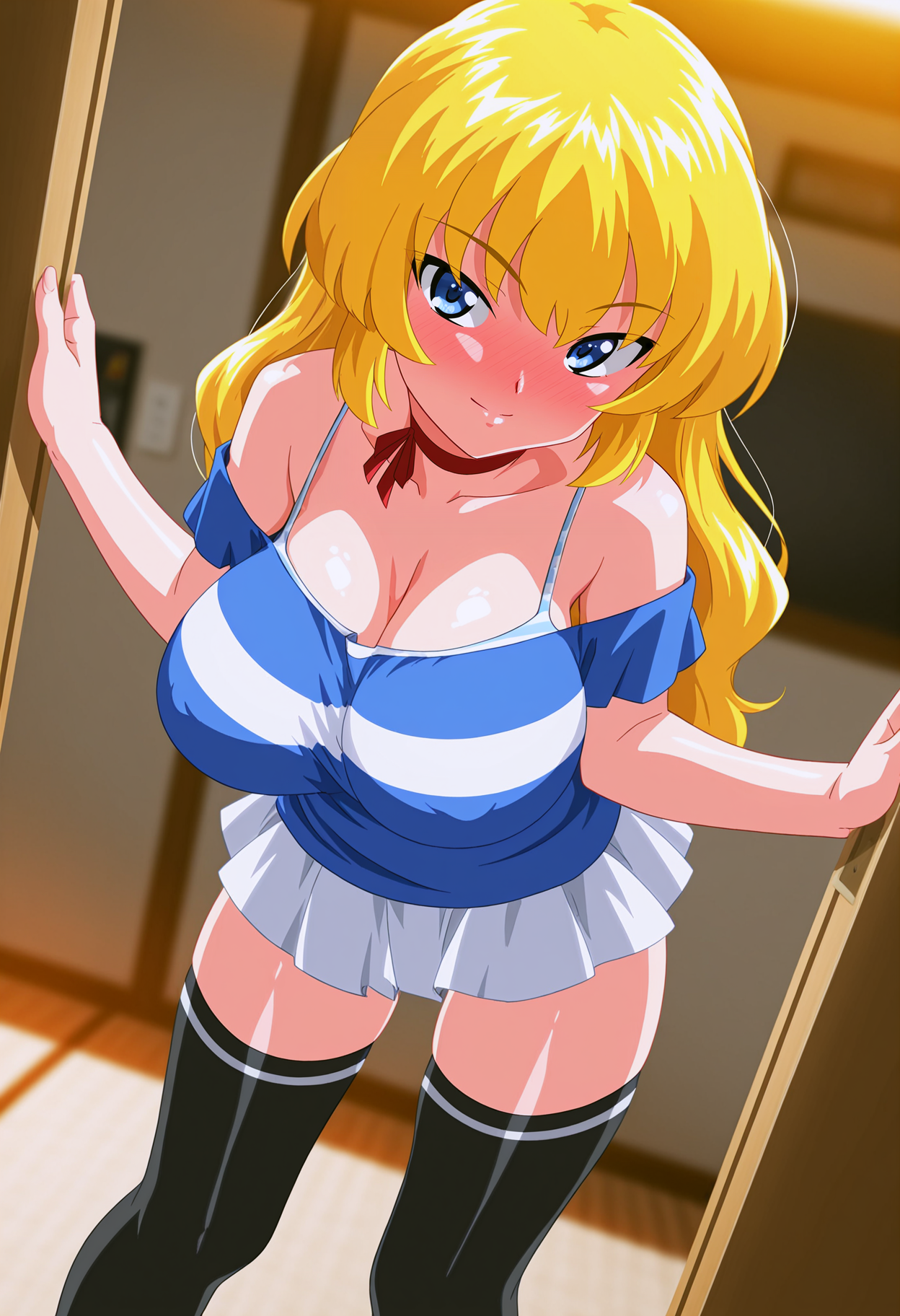制服、白シャツ、長袖、赤いリボン、学校水着(衣装の下に水着)