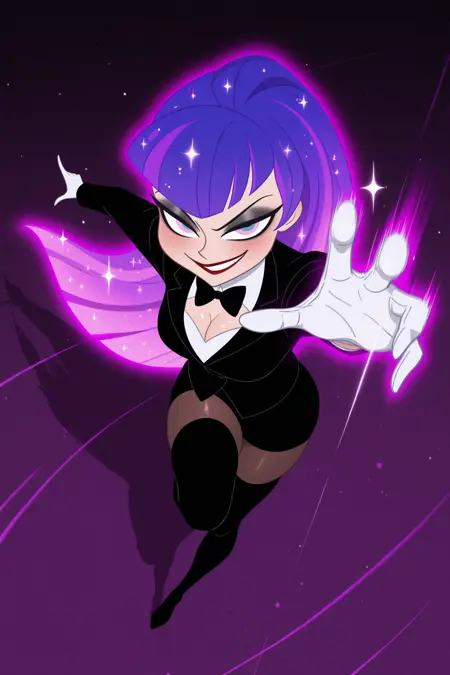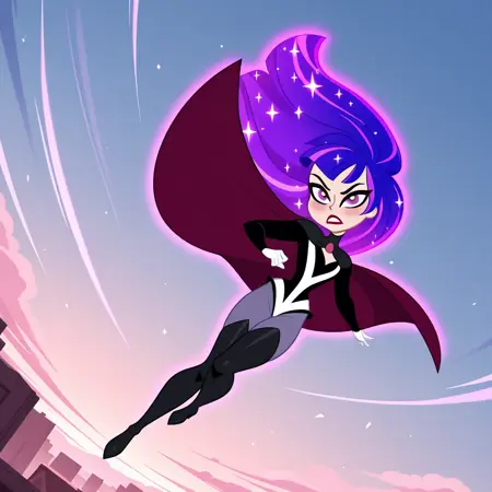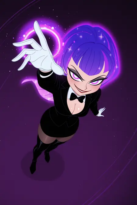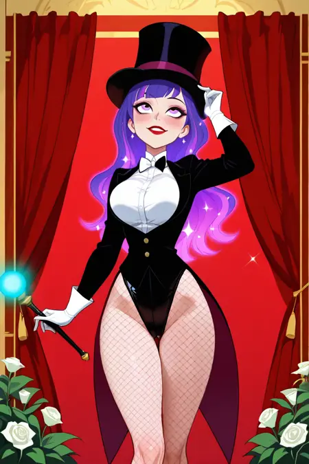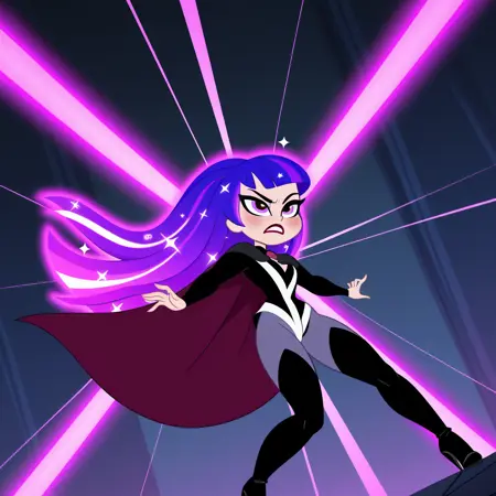 ザタナ、1人女孩、女性、白皙肌、薄紫の目、薄ピンクの頬紅、濃いマーロン色の口紅、光る紫の髪、キラキラした髪、黒い眉、黒いマント、濃いマゼンタ色のマント、ツートンカラーのマント、長袖フィットした黒のレotard、灰がかった紫のタイツ、太ももまで届く黒いスティレットブーツ、