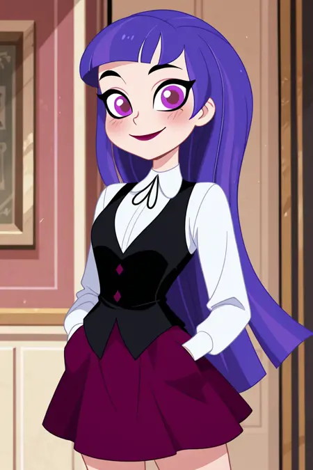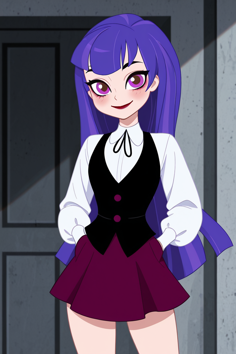 ジー、1人女孩、女性、白皙肌、薄紫の目、薄インディゴ色の髪、黒い眉、薄ピンクの頬紅、濃いマーロン色の口紅、黒いウェストコート、濃いマゼンタ色のボタン、白い袖、黒いリボン、短いスカート、濃いマゼンタ色のスカート、黒いハイヒールブーツ、