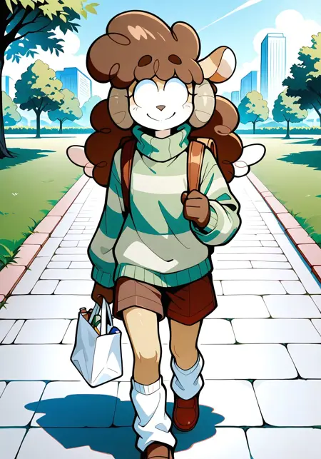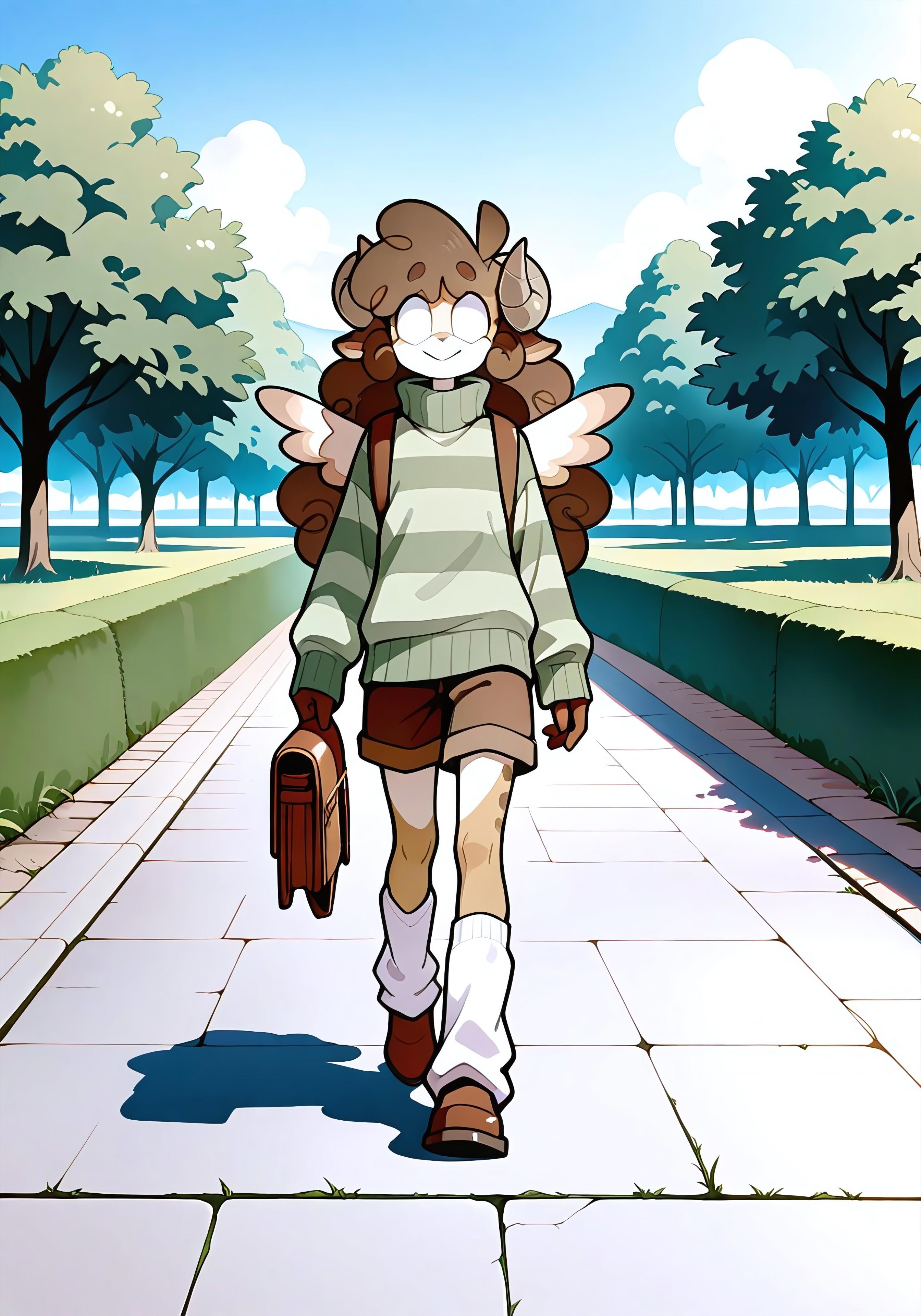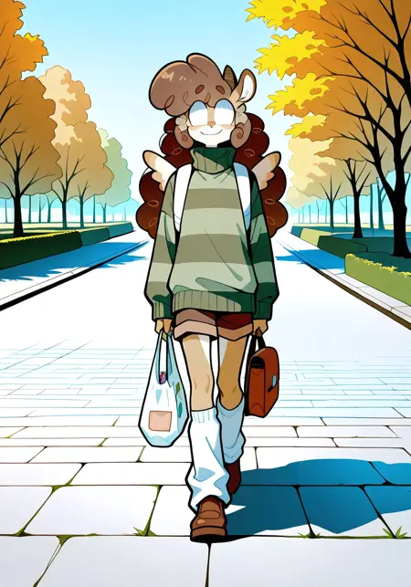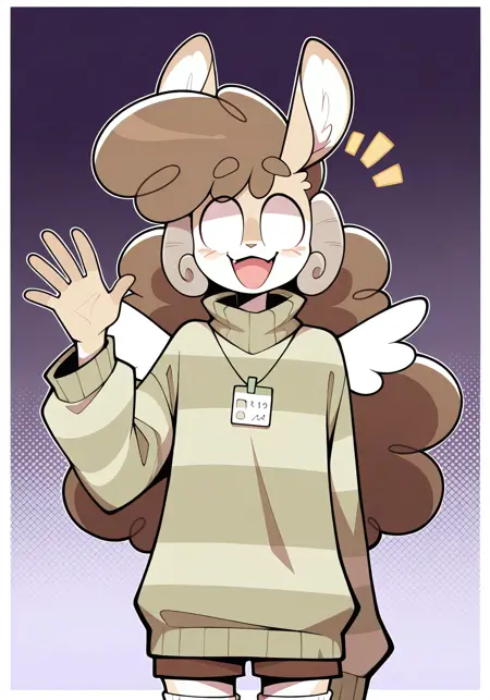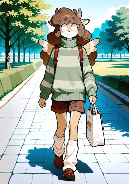 追加アイテム: オーバーサイズのタートルネックセーター、薄緑のタートルネックセーター、薄緑と濃緑のストライプセーター、茶色のショートパンツ、白いレッグウォーマー、茶色の靴、天使のハロー、黒い首輪、首輪の黄色い鈴