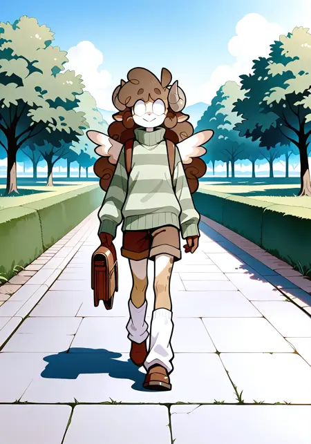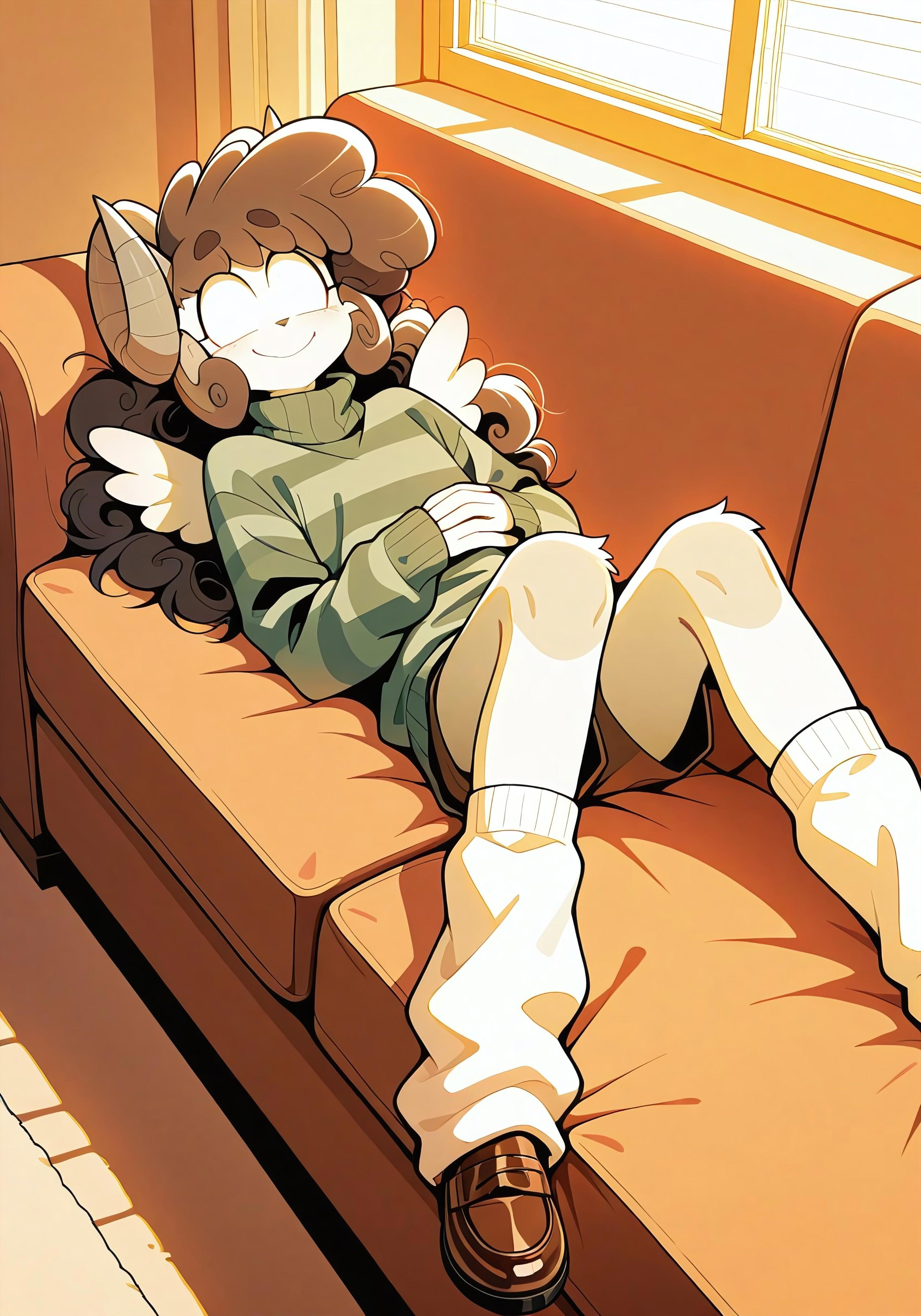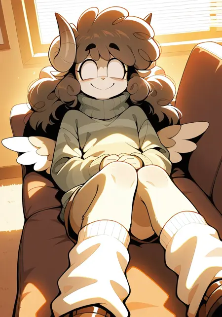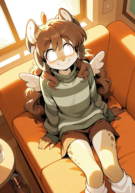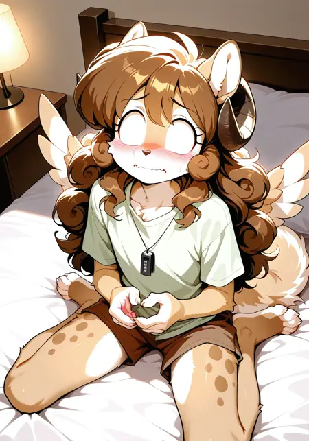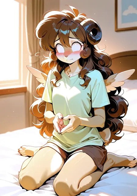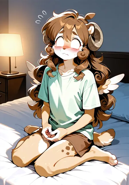 主要タグ: ram、灰色の巻き角、ベージュの肌、ベージュの毛、カールした髪、茶色のカールした髪、小さな天使の翼、無表情の目、白い無表情の目、長い髪、小柄、低身長