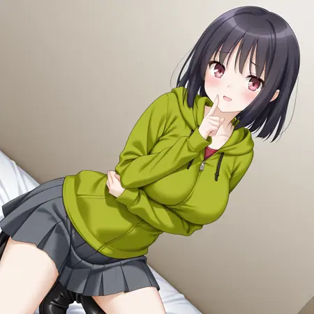 green hoodie with a zipper, red shirt underneath, gray pleated skirt, black kneehigh boots,