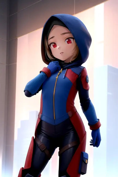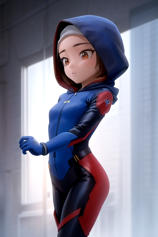 AliyaEjen, 1girl, solo, hood, blue gloves, hood up, brown eyes, bodysuit, hijab, pants