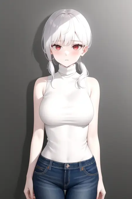AmeliaVNadezhde, 1girl, solo, long hair, breasts, skirt, red eyes, bare shoulders, white hair, low ponytail, sleeveless, denim pants, ribbed sweater, turtleneck, pale skin, white sweater,