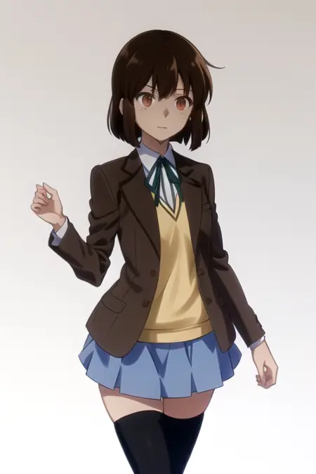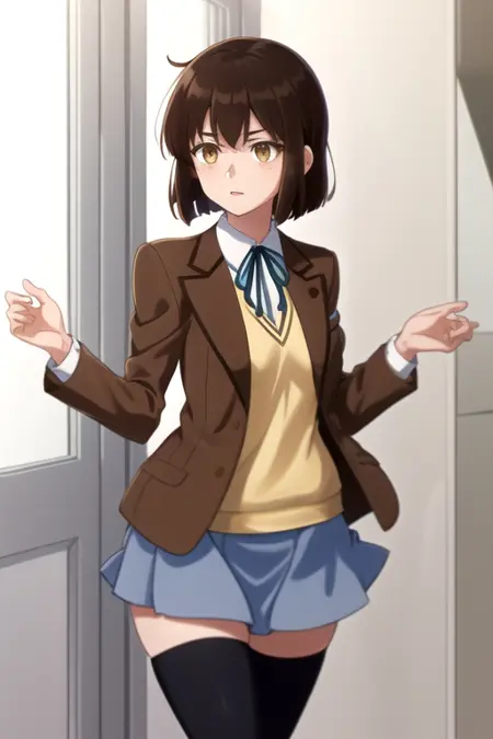 AmiaLee, 1girl, solo, short hair, white shirt, pleated skirt, brown hair, long sleeves, black thighhighs, neck ribbon, brown eyes, brown blazer, school uniform, pleated skirt, miniskirt, open blazer, blue skirt, neck ribbon, bob cut, yellow sweater vest