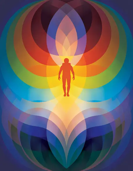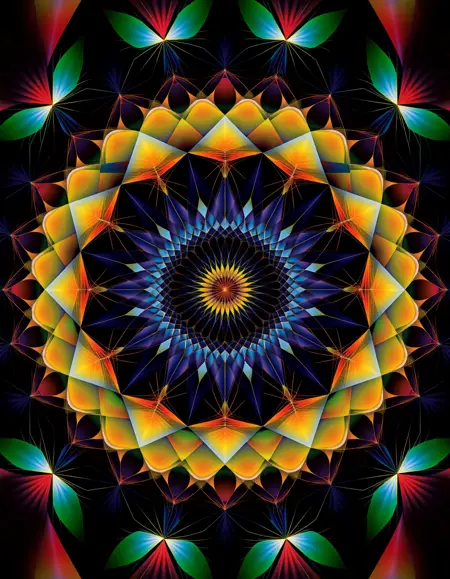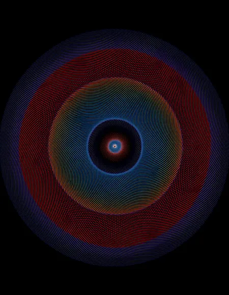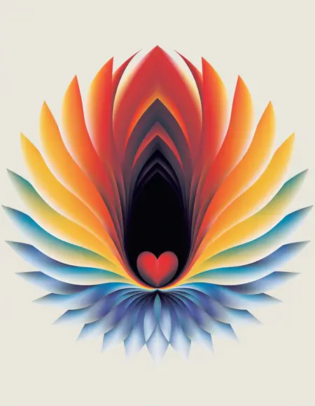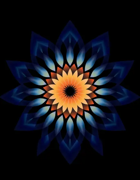 冷たい青やターコイズから温かい赤やオレンジへとグラデーションする、重なり合った半透明の花びらで構成された抽象的な放射状のパターンを、柔らかい薄い背景に円形で対称的な形状として描き、滑らかな移行とソフトなグラデーションで構造を強調した andy-gilmore のスタイル