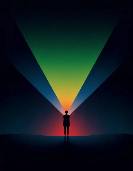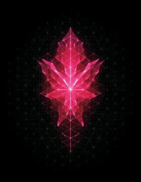 中心点から拡がる抽象的な幾何学的な立方体のデザイン。各面には赤、オレンジ、青、紫、緑のグラデーショングリッドが含まれ、黒く明確に輪郭が描かれている。背景は無彩色の濃い青で、鮮やかな立方体と強いコントラストを形成し、細かい線で構成されたグリッドパターンが微妙な奥行きと三次元性を加えた andy-gilmore のスタイル