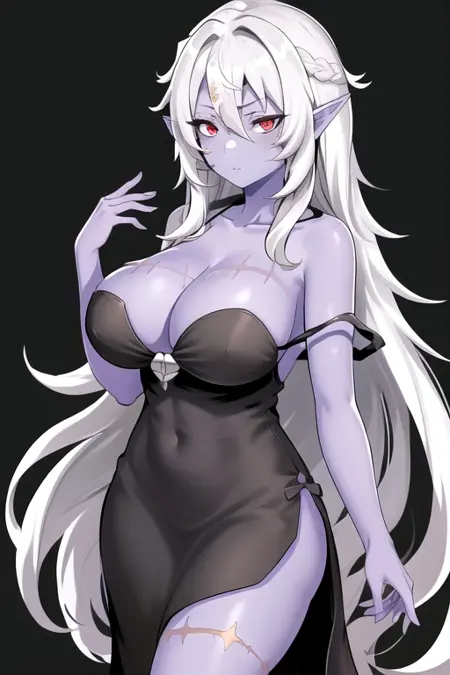 N3cromancer4, 1girl, colored skin, pointy ears, purple skin, solo, very long hair, black dress, red eyes, cleavage, strap slip, white hair, large breasts, scar, bare shoulders, grey hair,