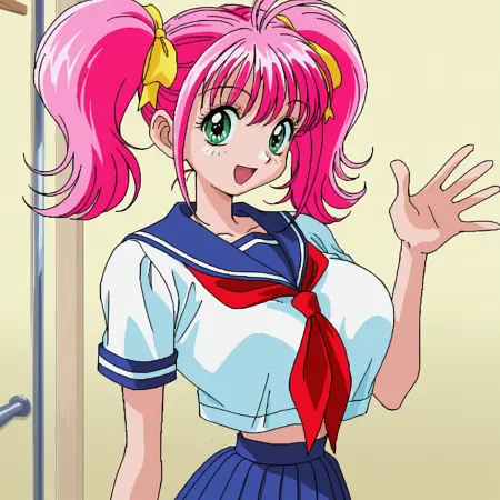 制服:mirurupsr,绿色眼睛,粉色双马尾,黄色发带,细腰女性,丰满大胸,蓝白水手服,短袖,红色领巾,蓝色百褶裙,白色袜子,棕色日本校鞋