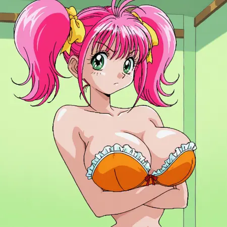 内衣:mirurupsr,绿色眼睛,粉色双马尾,黄色发带,细腰女性,丰满大胸,橙色无肩带内衣,白色花边