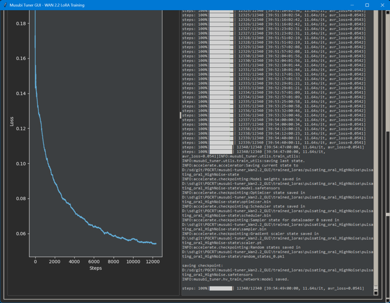 しかし、何らかの理由で649個の動画キャッシュが作成され、最終的に12,340ステップに達しました…(39時間54分 / 1LoRA)