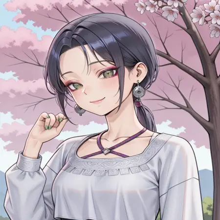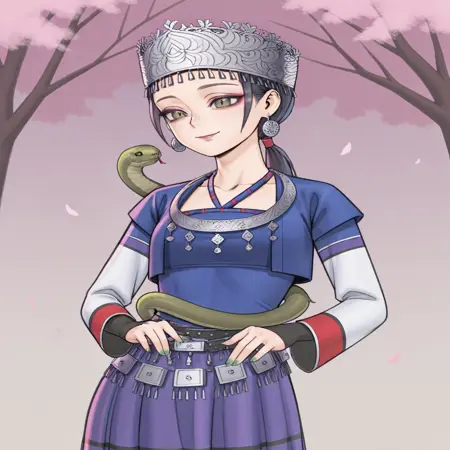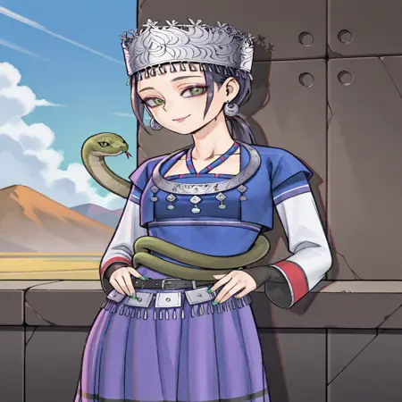 1girl, jewelry, snake, solo, green eyes, earrings, layered sleeves, looking at viewer, short over long sleeves, long sleeves, skirt, simple background, smile, nail polish, white background, belt, short sleeves, crown, long hair, black hair, purple skirt, transparent background, cowboy shot, Haryeongseo