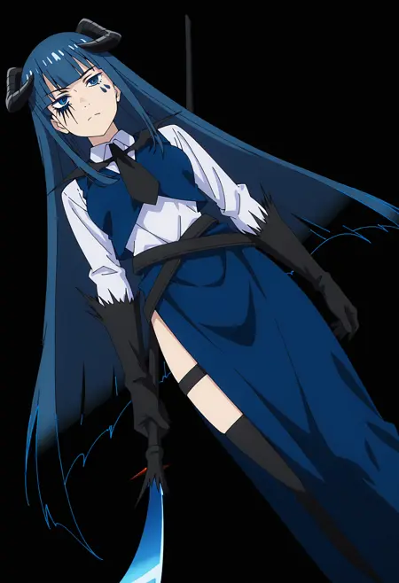 1girl, solo, blue destroyer, demon girl, very long hair, blue hair, black hair, bangs, blunt bangs, blue eyes, horns, demon horns, facial tattoo