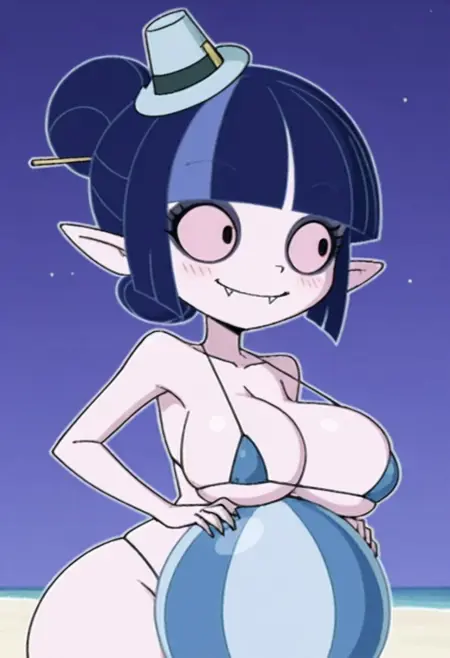 拉维娜,深蓝色头发,多彩头发,双色头发,小帽子,发髻,齐刘海,尖牙,深色眼影,尖耳朵,青绿色连衣裙,手套