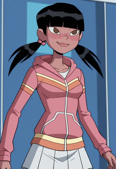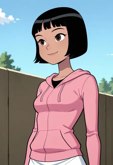 프롬프트: JulieUAF, 1girl, solo, full body, 갈색 눈, 단발, 볼컷, 검은 머리, 분홍 후드티, 후드 내려짐, 검은 셔츠, 가슴, 긴 소매, 흰 치마, 양말, 흰 신발, 검은 피부를 가진 여성