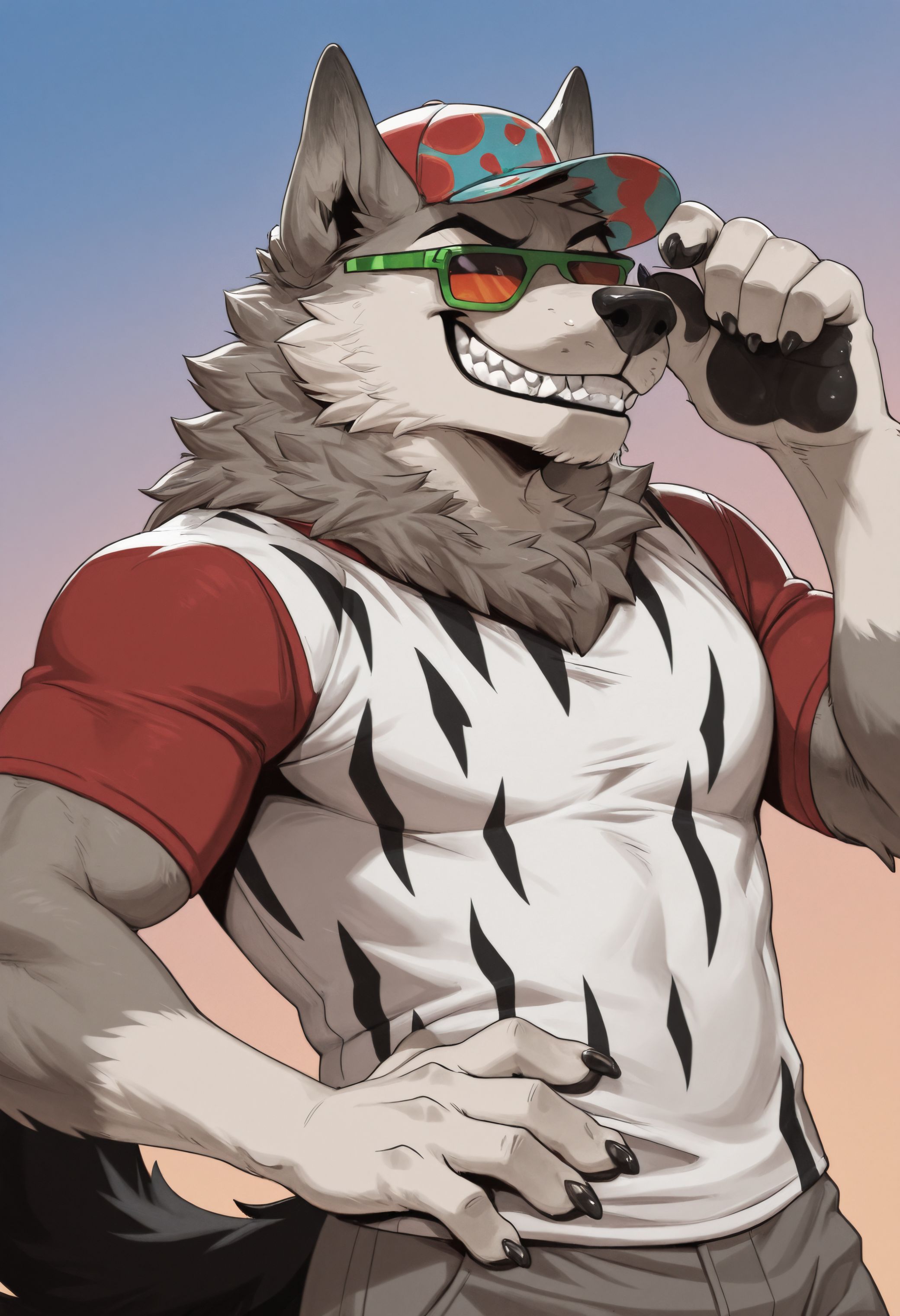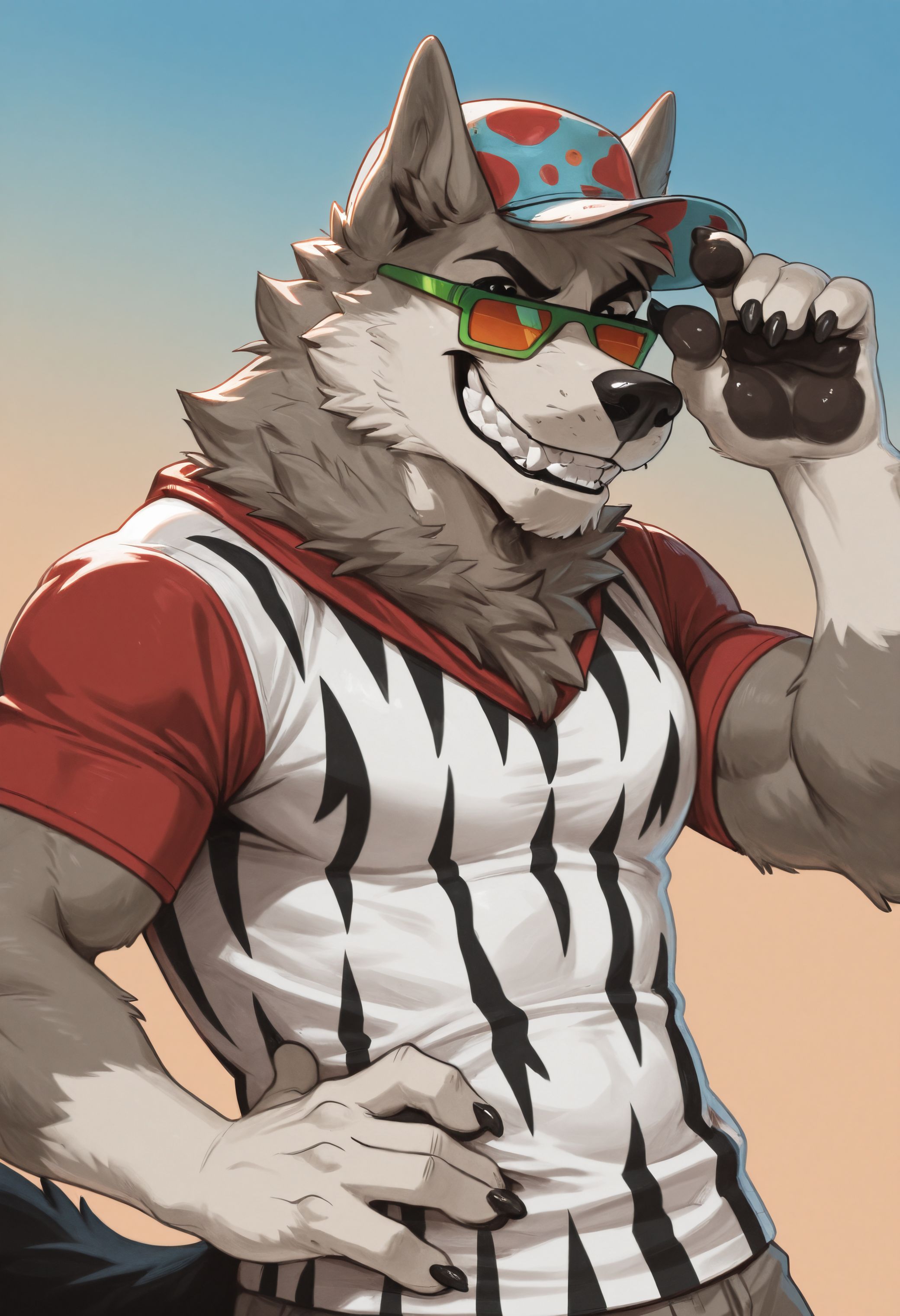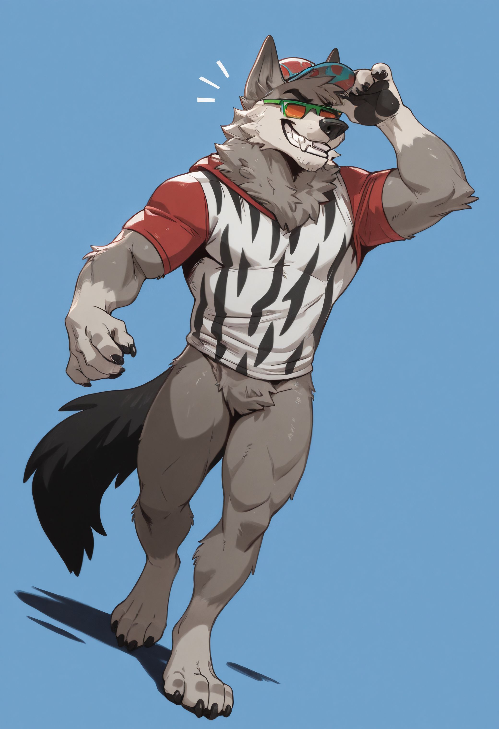 Illustrious: best quality, amazing quality, very aesthetic, absurdres, hires, patxi, wolfthorn_(old_spice), furry male, furry, 1boy, solo, sunglasses, hat, shirt, claws, black tail, bottomless, ...your tags...