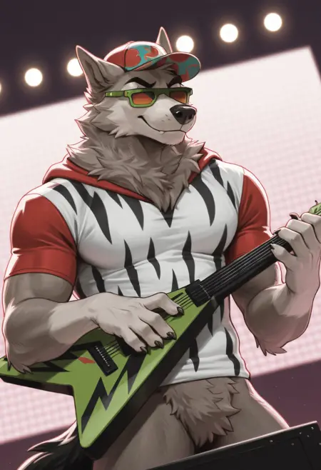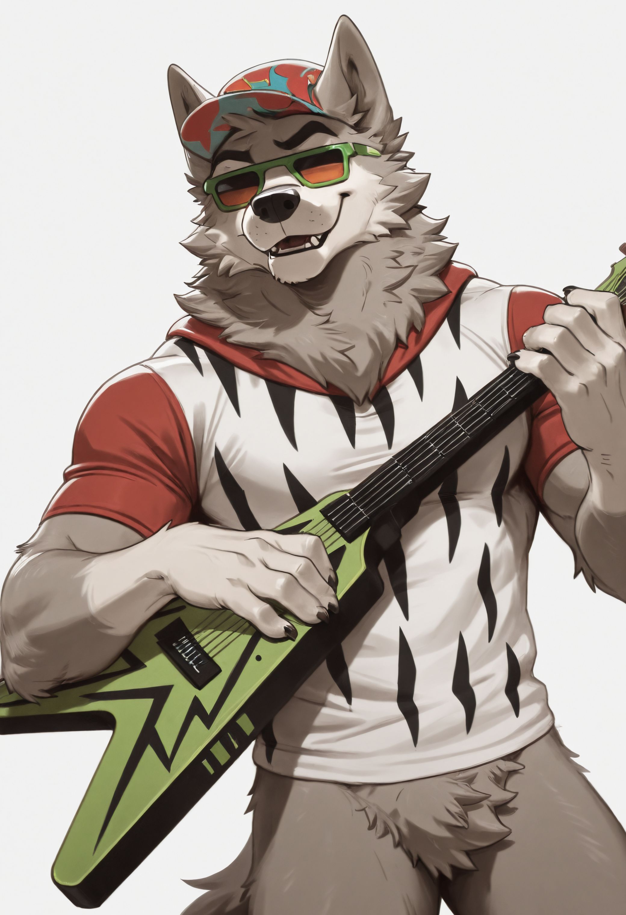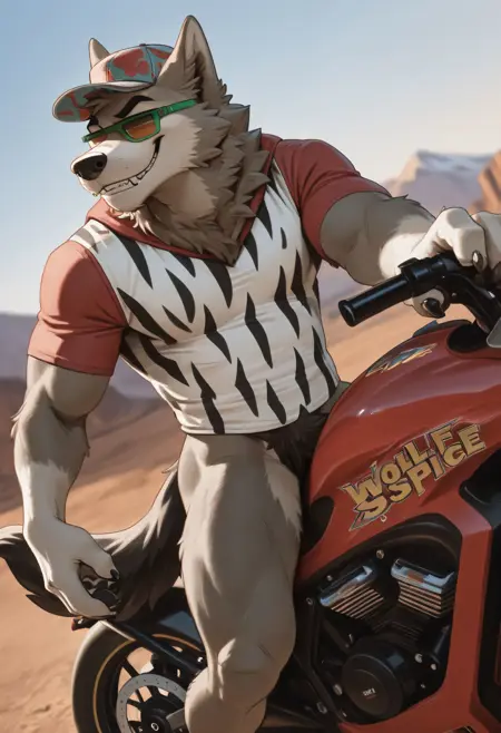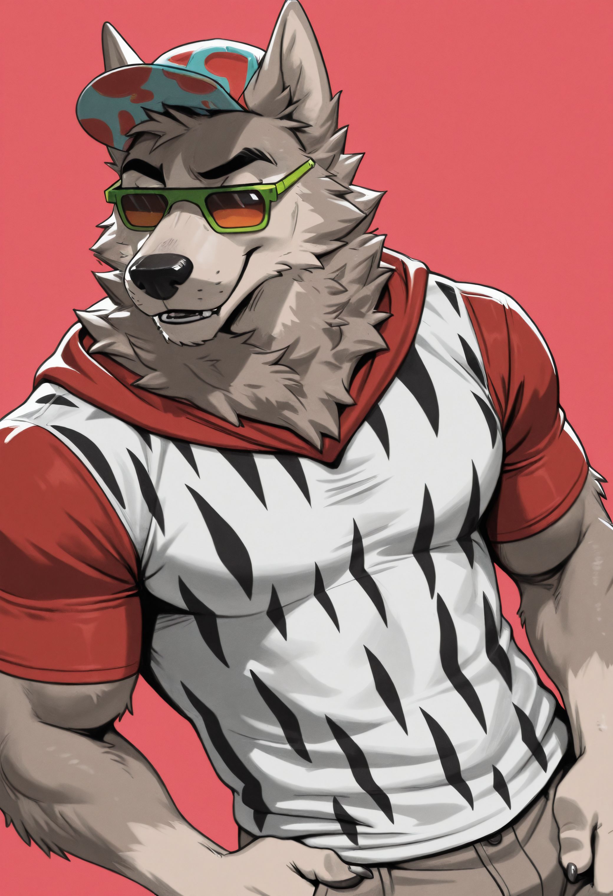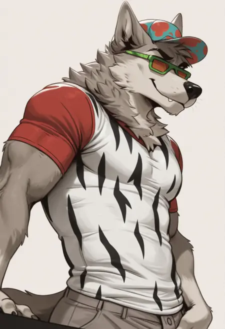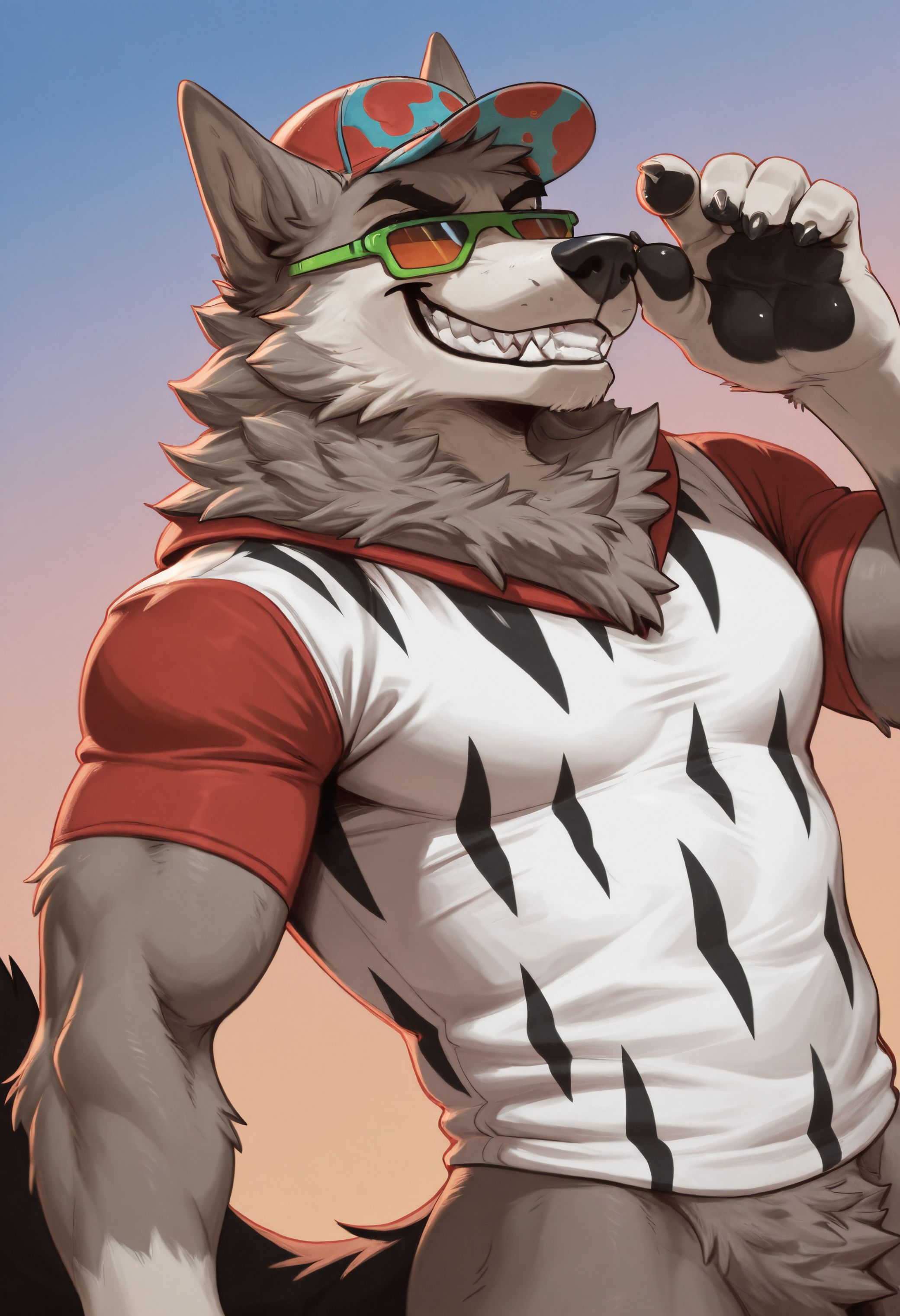 Illustrious: best quality, amazing quality, very aesthetic, absurdres, hires, patxi, wolfthorn_(old_spice), furry male, furry, 1boy, solo, sunglasses, hat, shirt, claws, black tail, bottomless, ...your tags...