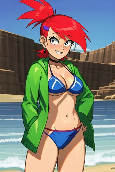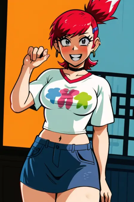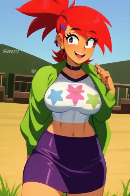 옷차림 태그: 짧은 헤어스타일, 목걸이, 머리핀, 머리 장식, 셔츠, 초록색 자켓, 피어싱, 복부 노출, 스커트