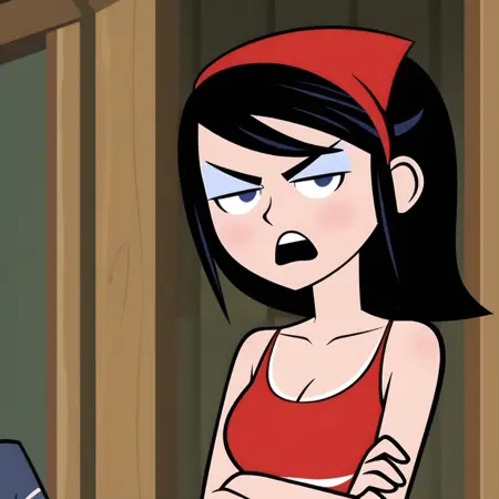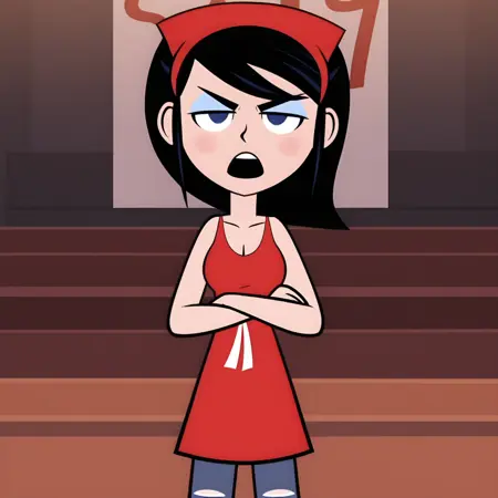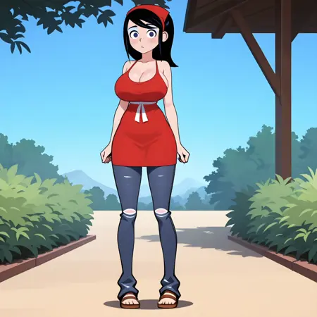 标签:黑发,红色头带,化妆,蓝眼睛,红色无袖连衣裙,白色腰带,破洞牛仔裤,棕色凉鞋,蓝色眼影