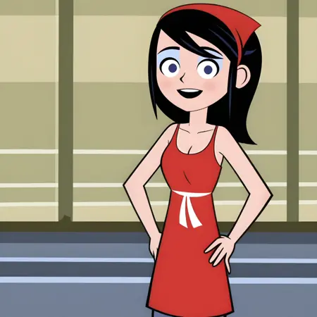 TAGS: black hair, red headband, make up, blue eyes, red sleeveless dress, white waist ribbon, ripped jeans, brown sandals, blue eyeshadows